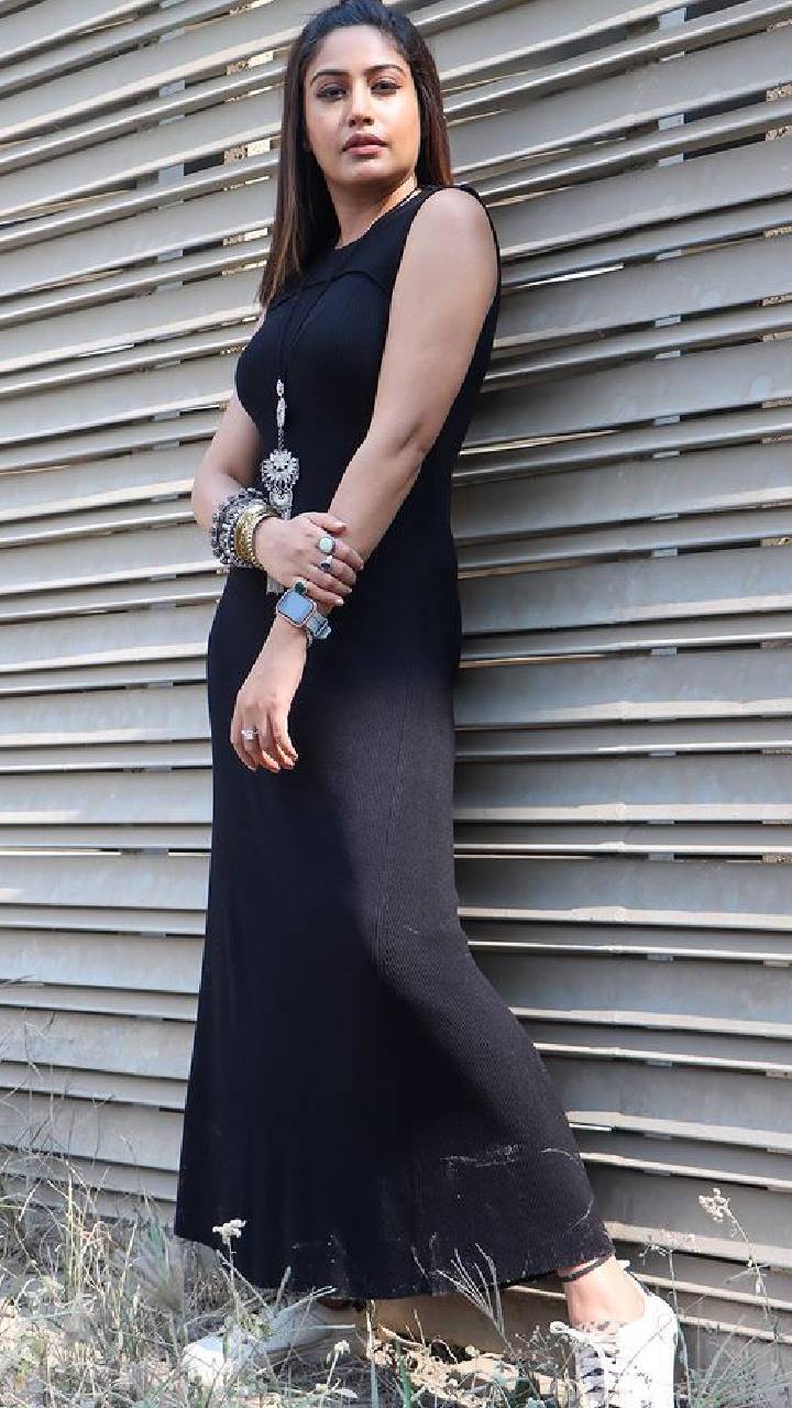 सुरभि का ब्लैक गाउन संग हाथों और गले में ऑक्सीडाइज ज्वैलरी, हॉफ पौनी हेयर स्टाइल वाला अट्रैक्टिव लुक फैंस का ध्यान खींच रहा है।