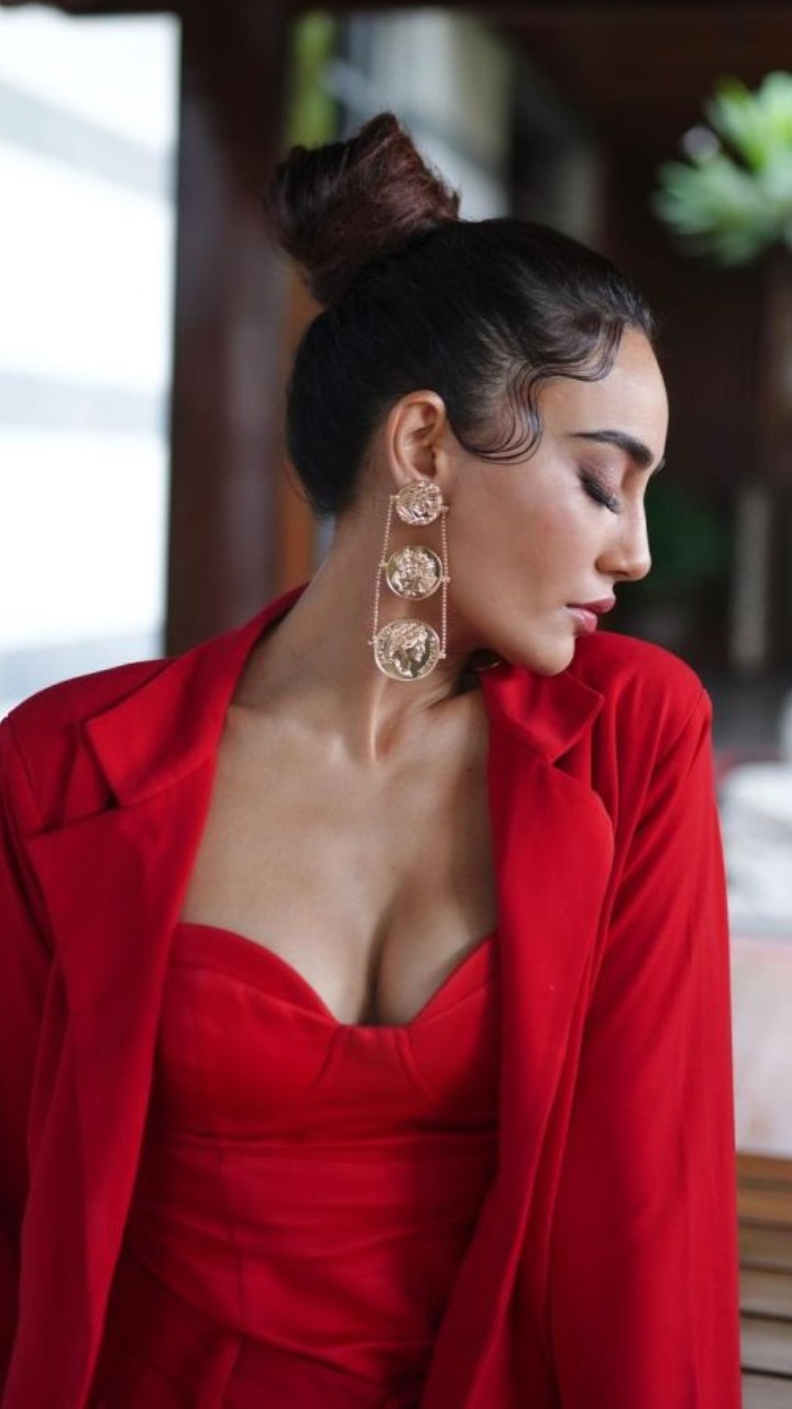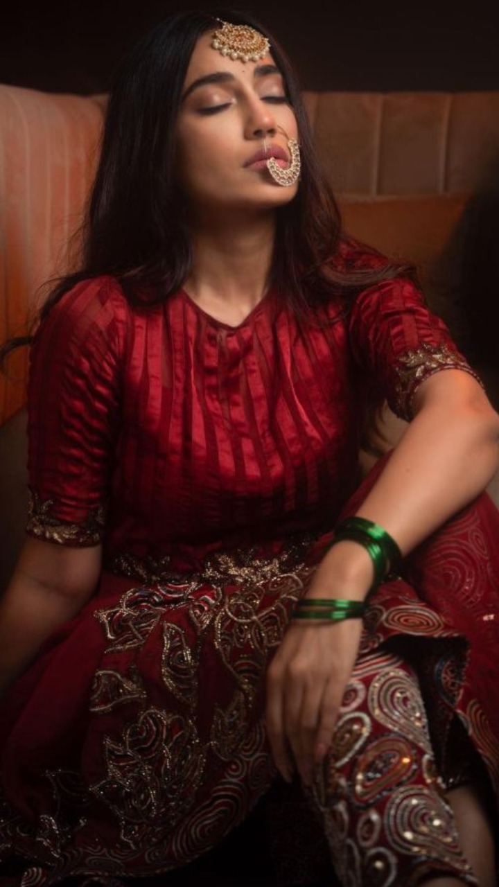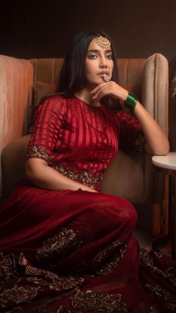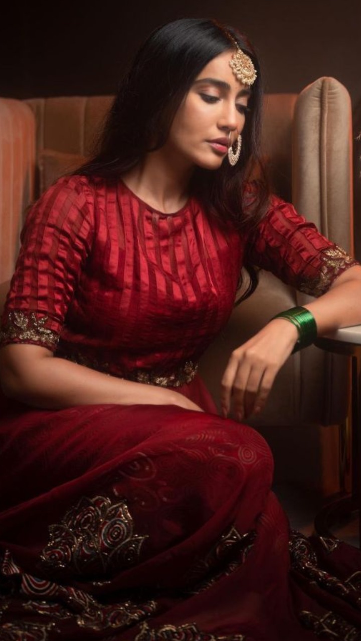 सुरभि इस रेड कलर की इंडो वेस्टर्न ड्रेस में बेहद गॉर्जियस दिख रही हैं। वही एक्ट्रेस की बिग नोज रिंग और माथे का टीका उनकी सुंदरता को और बढ़ा रहा है।
