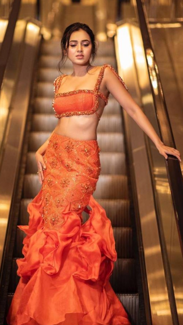 ऑरेंज कलर के इस आउटफिट में तेजस्वी अपना टोन्ड फिगर फ्लॉन्ट करती नजर आ रही हैं।