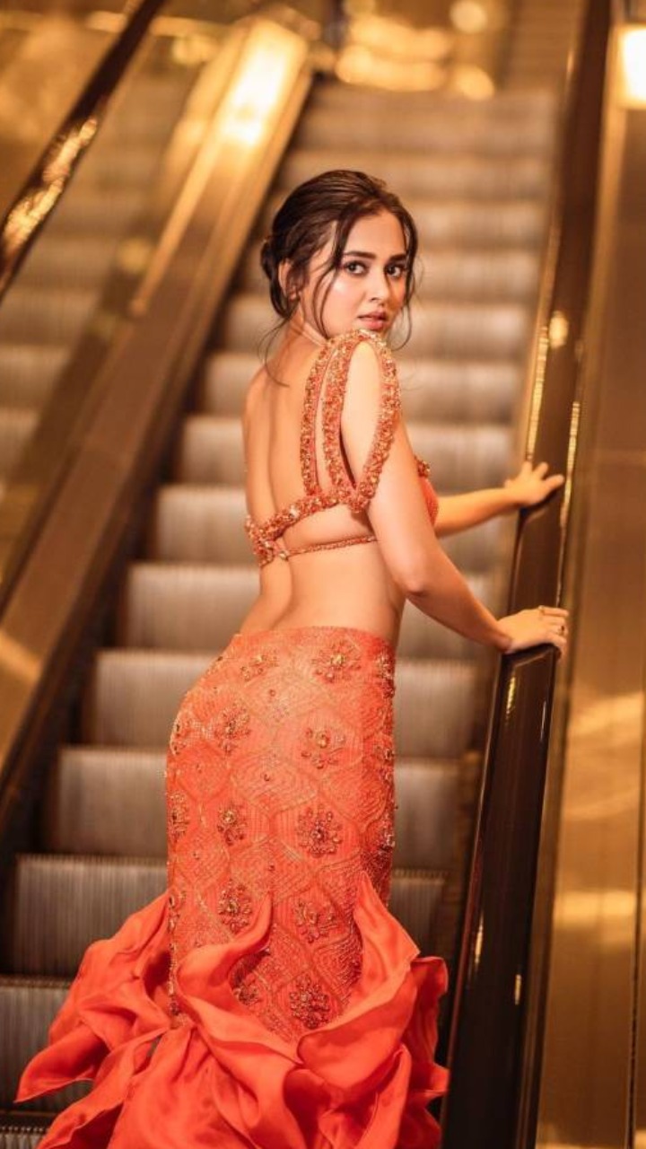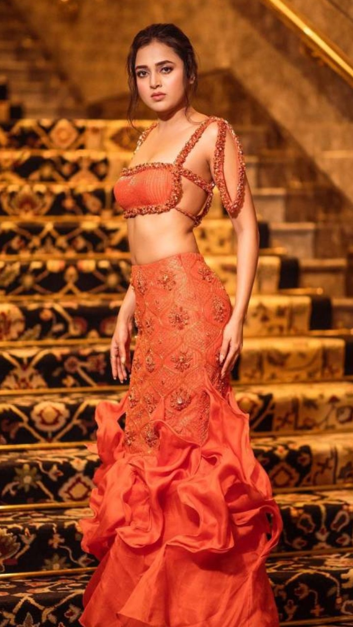 तेजस्वी ने तस्वीर में ऑरेंज कलर की बैकलेस बॉडीकॉन चोली और स्कर्ट पहनी हुई हैं। एक्ट्रेस का ये ड्रेसिंग सेंस काफी यूनिक हैं।