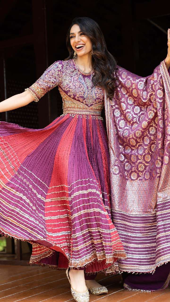 शोभिता धुलिपाला पर्पल और पिंक कलर के क्रैप सूट में बेहद गॉर्जियस लग रही हैं। यंग गर्ल्स उनके इस लुक को कॉपी कर सकती हैं।