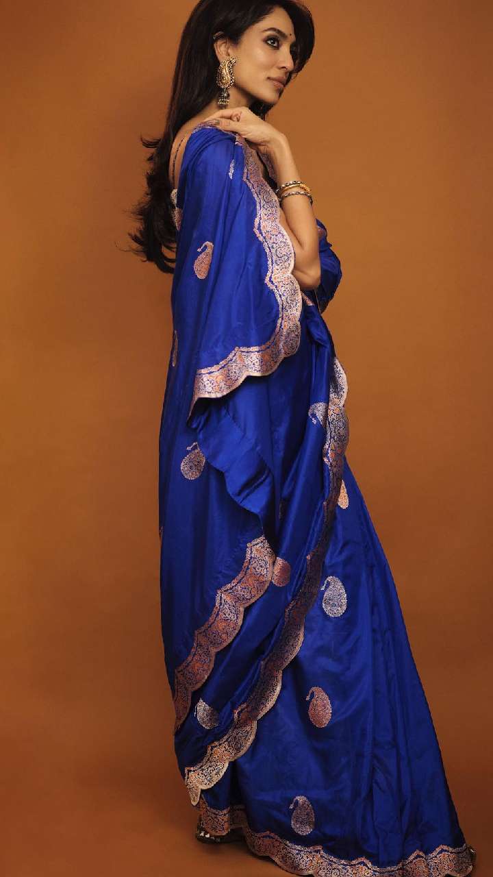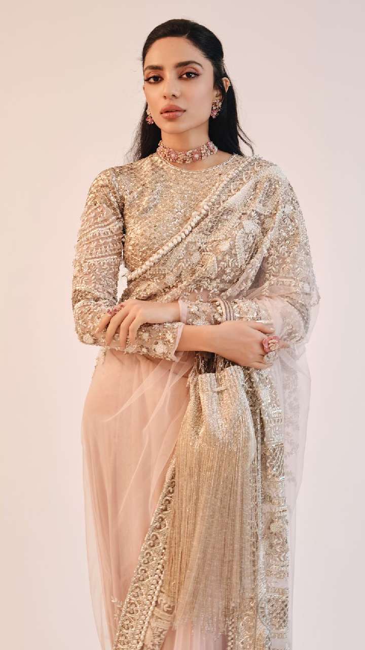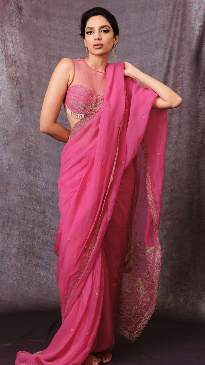 एक्ट्रेस पीच कलर की नेटिड साड़ी हैवी वर्क जीरो नेक ब्लाउज में कहर ढहा रही हैं। वेडिंग में आप इस लुक से आइडिया ले सकती हैं।