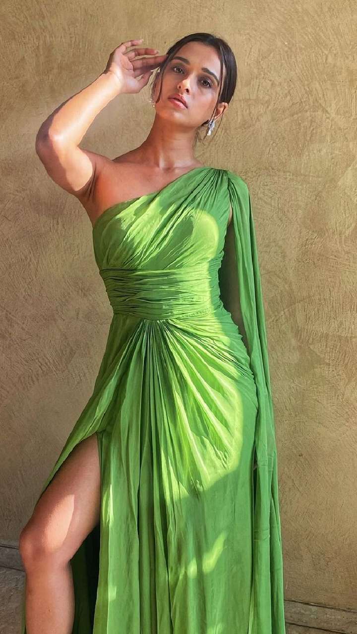 ग्रीन कलर के वन शोल्डर थाई हाई स्लिट ड्रेस में एक्ट्रेस बेहद हॉट अंदाज में नजर आ रही हैं। फैंस कमेंट्स में एक्ट्रेस को हॉटनेस क्वीन बता रहे हैं।