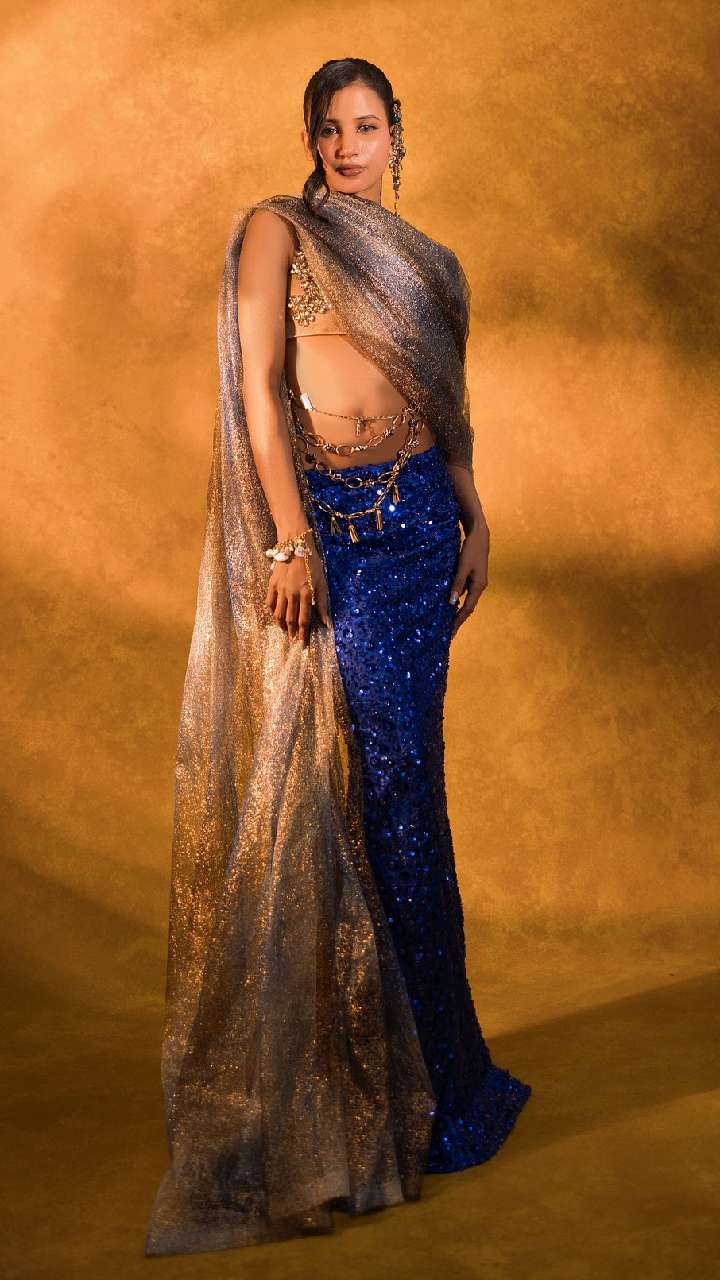 नैन्सी त्यागी गोल्डन कलर की थाई स्लिट ड्रेस में काफी खूबसूरत लग रही हैं। उनका ये लुक फैंस को खूब पसंद आया।