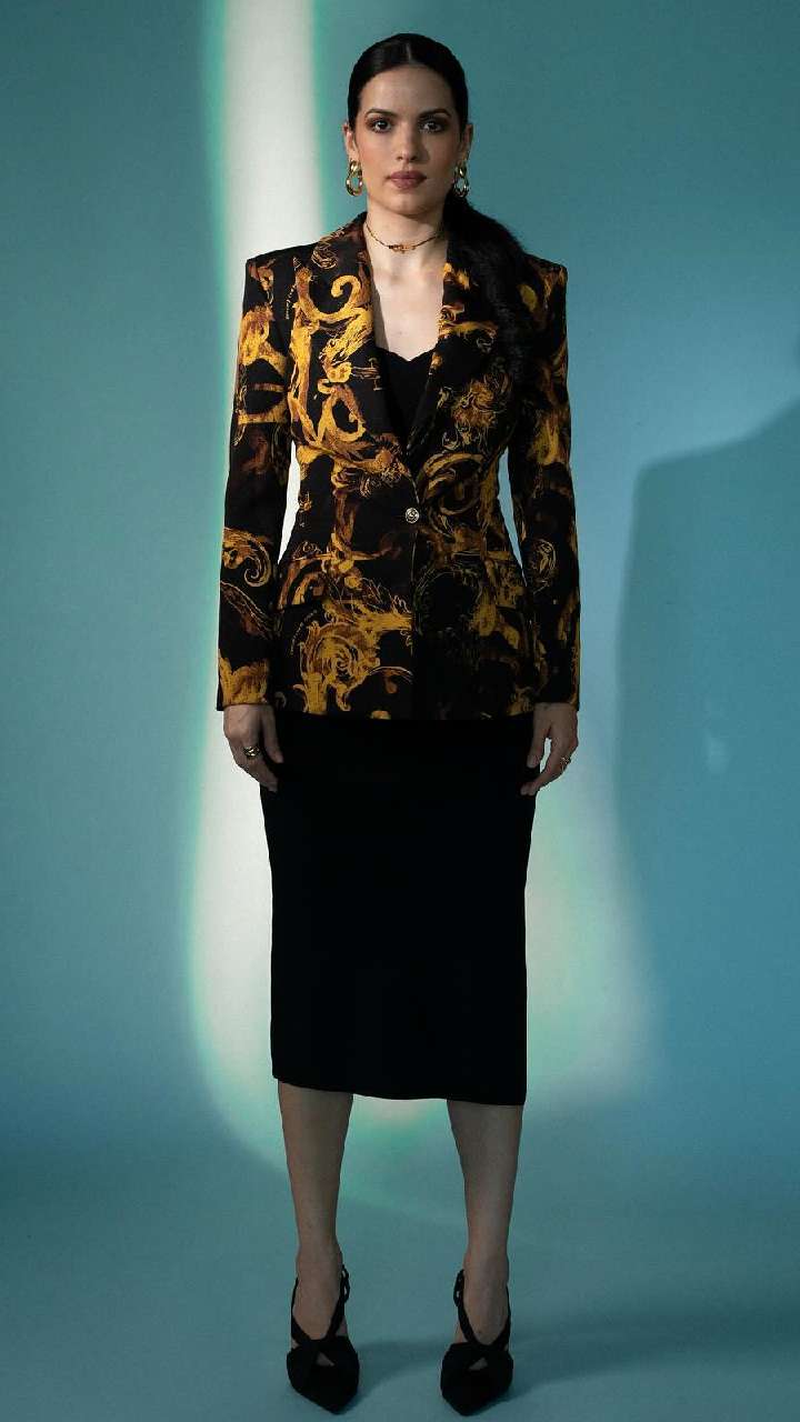 नताशा ब्लैक कलर के बॉडीकॉन ड्रेस पहनी है। उन्होंने लुक को कंप्लीट करने के लिए प्रिंटेड ब्लेजर कैरी किया है, जो उनको स्टाइलिश लुक दिखने में मदद कर रहा है। इस तरह के ड्रेस को आप भी ऑफिस के लिए ऑप्शन में रख सकती हैं।
