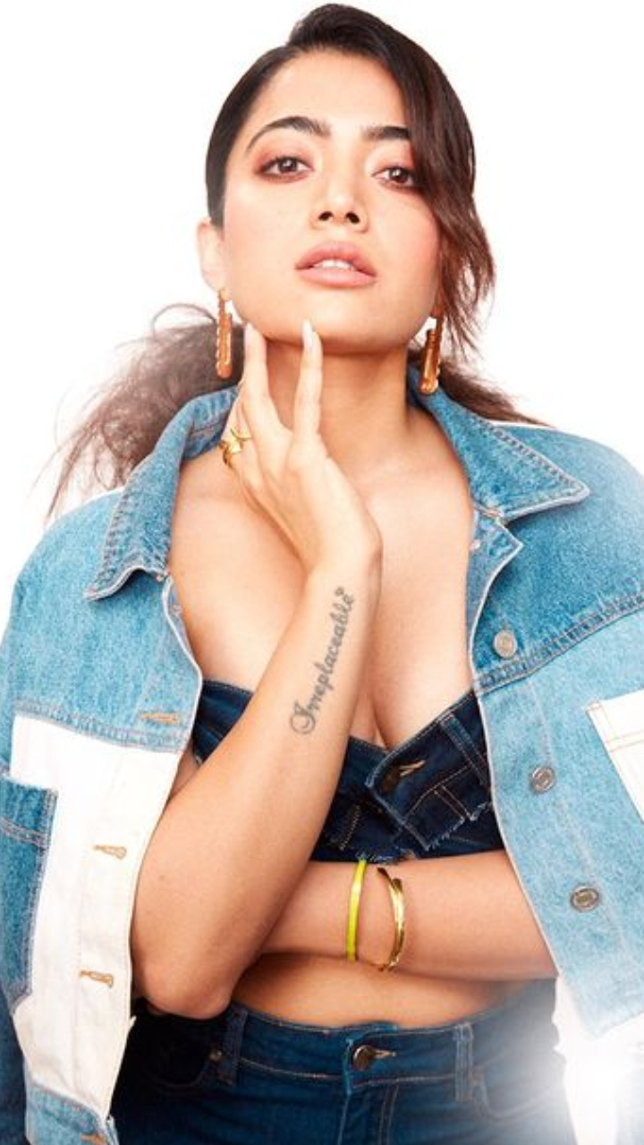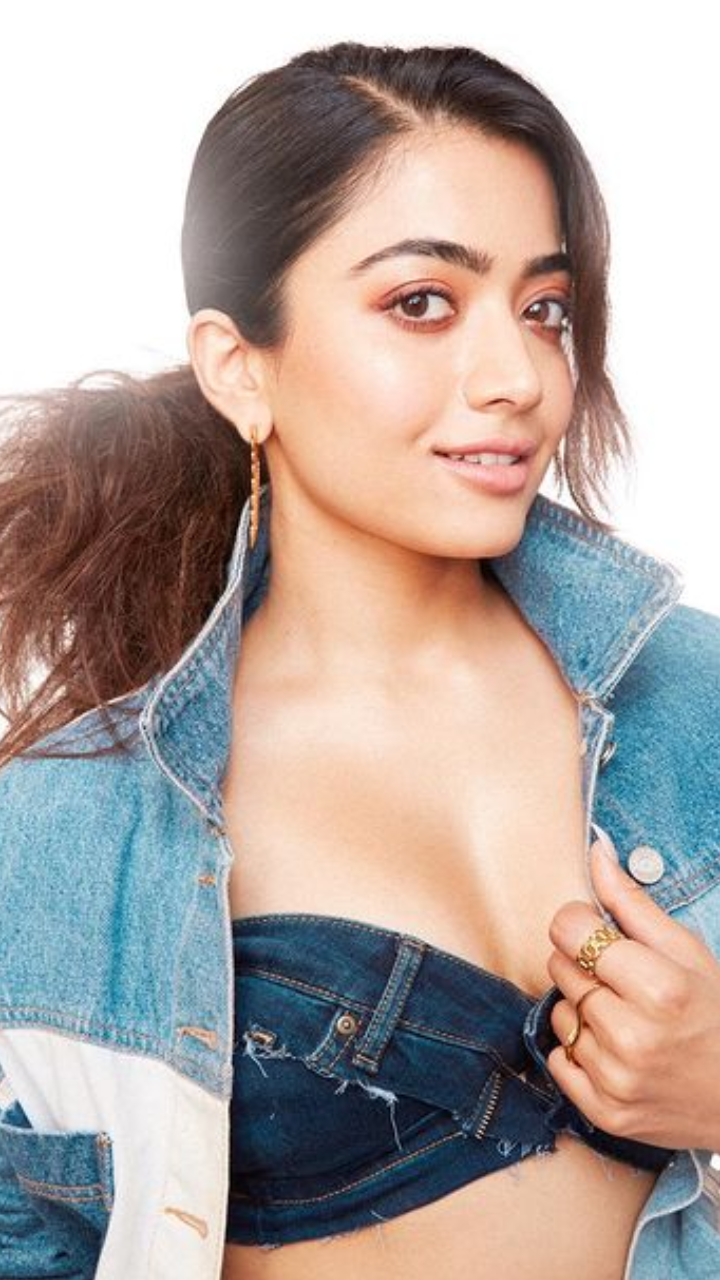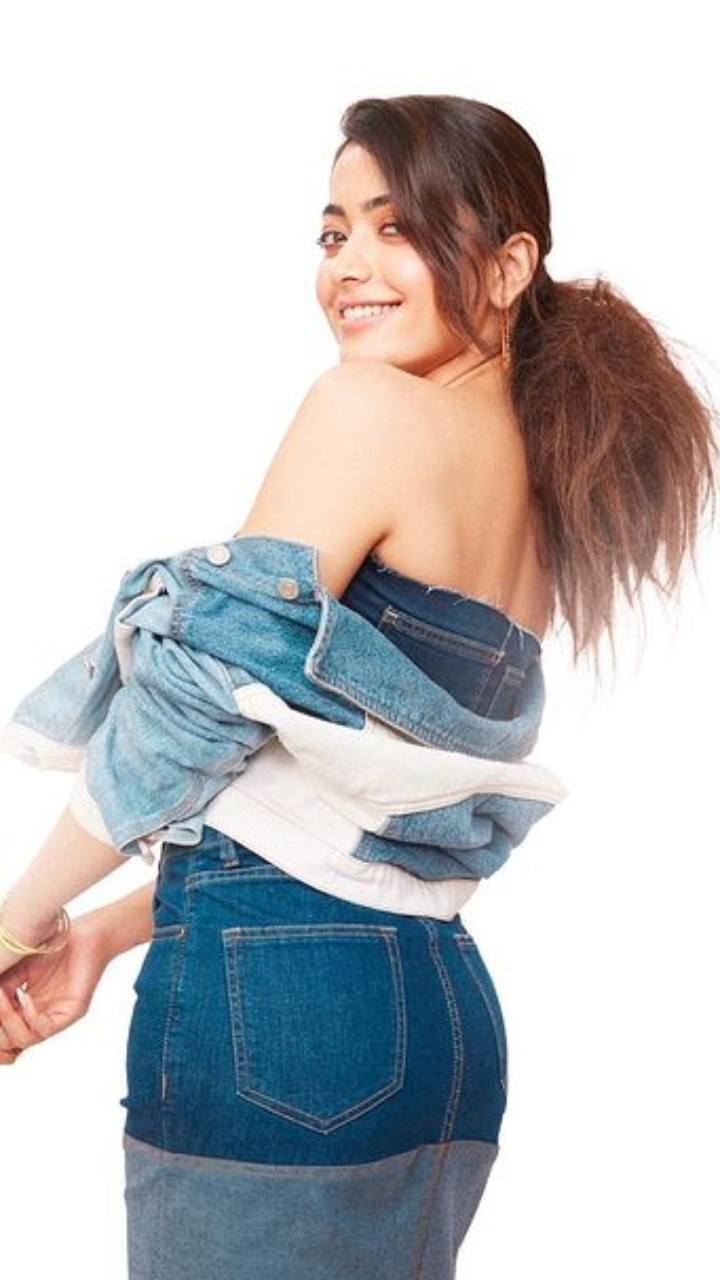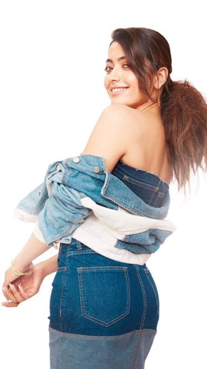 रश्मिका मंदाना क्रॉप टॉप और डेनिम जैकेट में बेहद स्टाइलिश लग रही हैं।