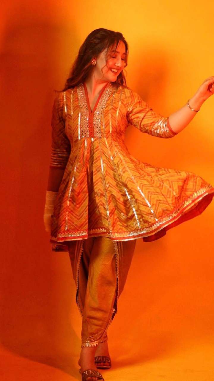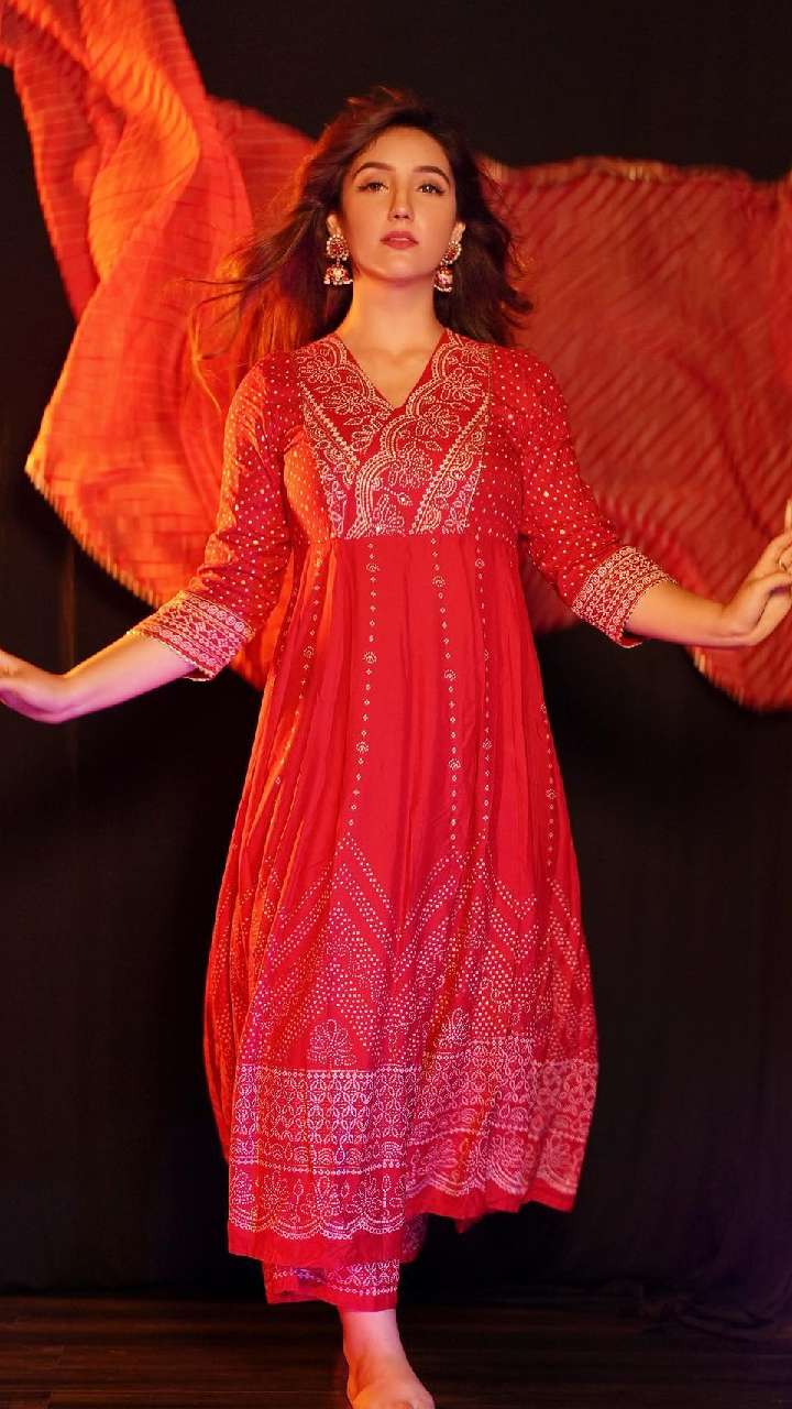 अशनूर का रेड डॉट प्रिंट ए लाइन सूट नवरात्रि पर आपके लिए बेस्ट ऑप्शन है। माता को लाल रंग सबसे प्रिय होता है।