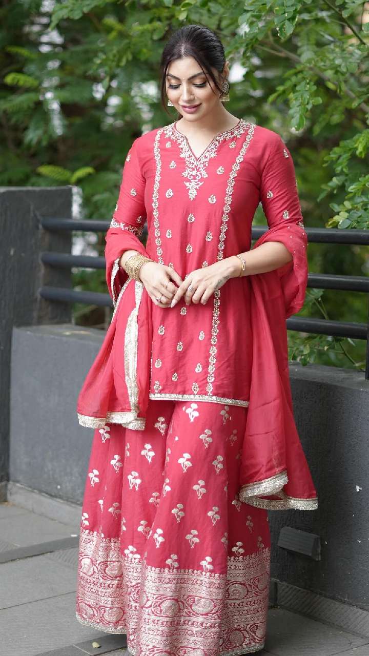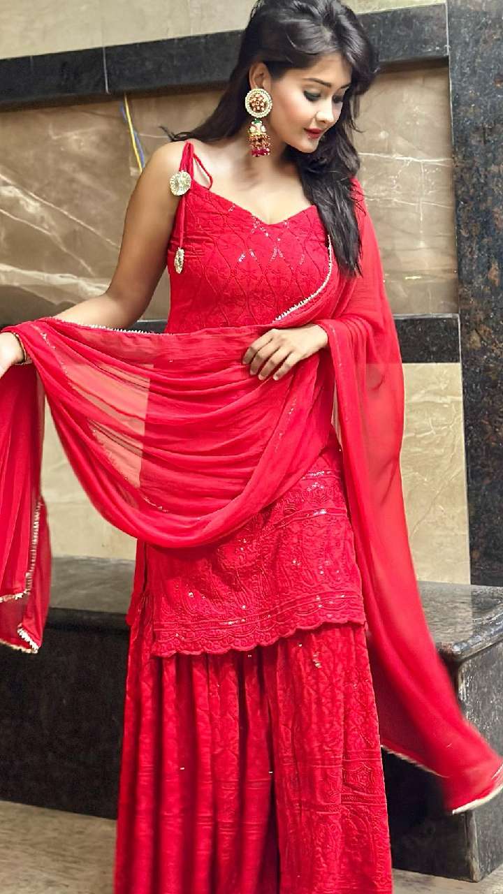 इशिता दत्ता का रेड शरारा सूट गोल्डन स्ट्रिप दुपट्टे के साथ काफी अट्रैक्टिव लुक दे रहा है। शादीशुदा ऐसे सूट में काफी जंचेंगी।