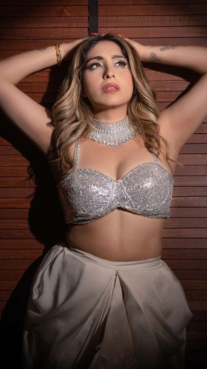 सिल्वर कलर की ब्रॉलेट और धोती में सिंगर अपना परफेक्ट फिगर फ्लॉन्ट करती देखी जा सकती हैं।