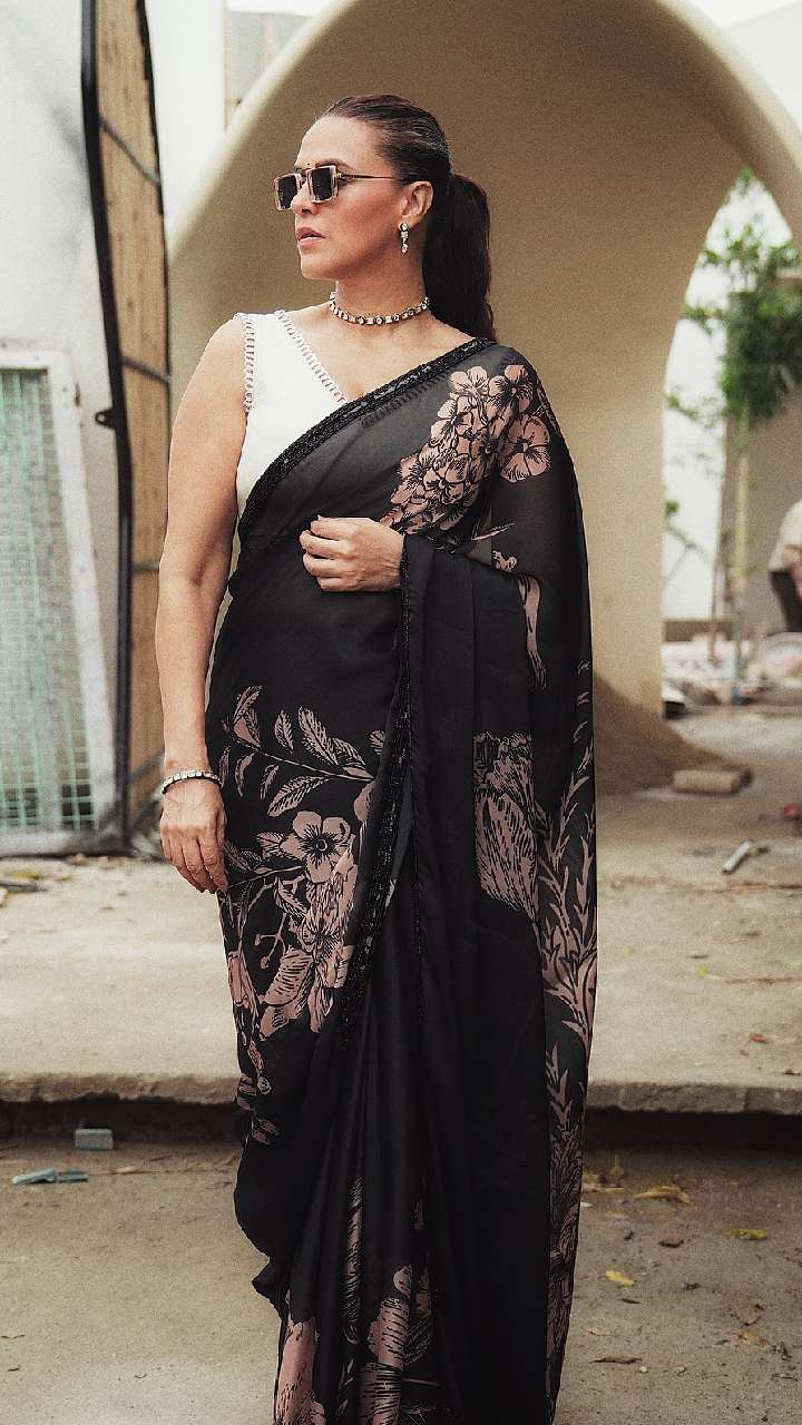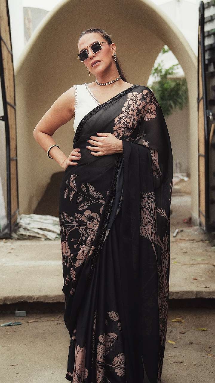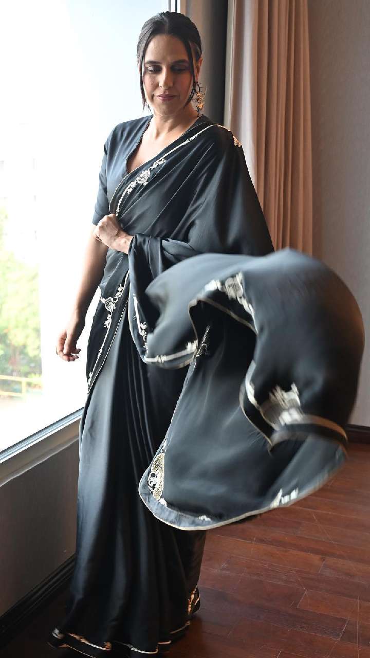 अगर आप ब्लैक लवर हैं तो आप नेहा धूपिया की तरह ही ब्लैक साड़ी को स्टाइल कर सकती हैं। एक्ट्रेस का ये लुक भी शानदार लग रहा है।