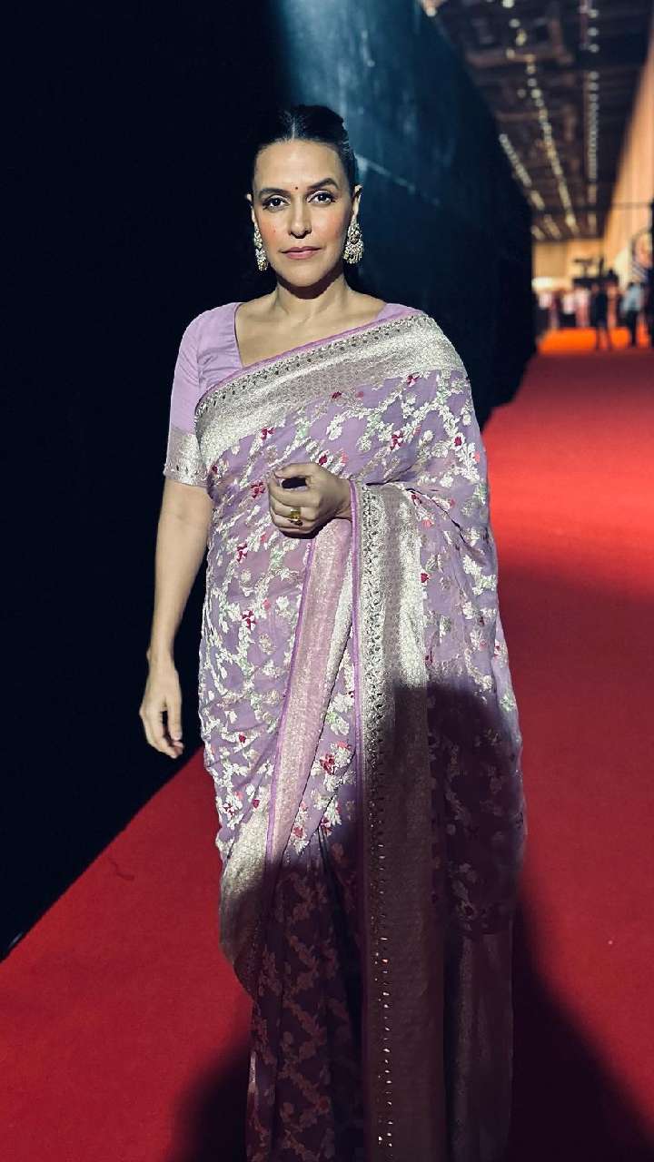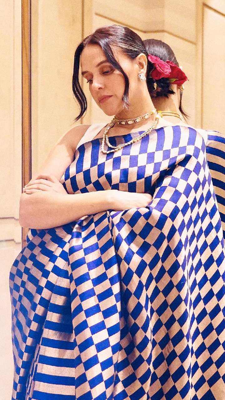 अपने लुक को सबसे अलग बनाने के लिए आप नेहा धूपिया की तरह ही चेक बॉक्स साड़ी को पहन सकती हैं।