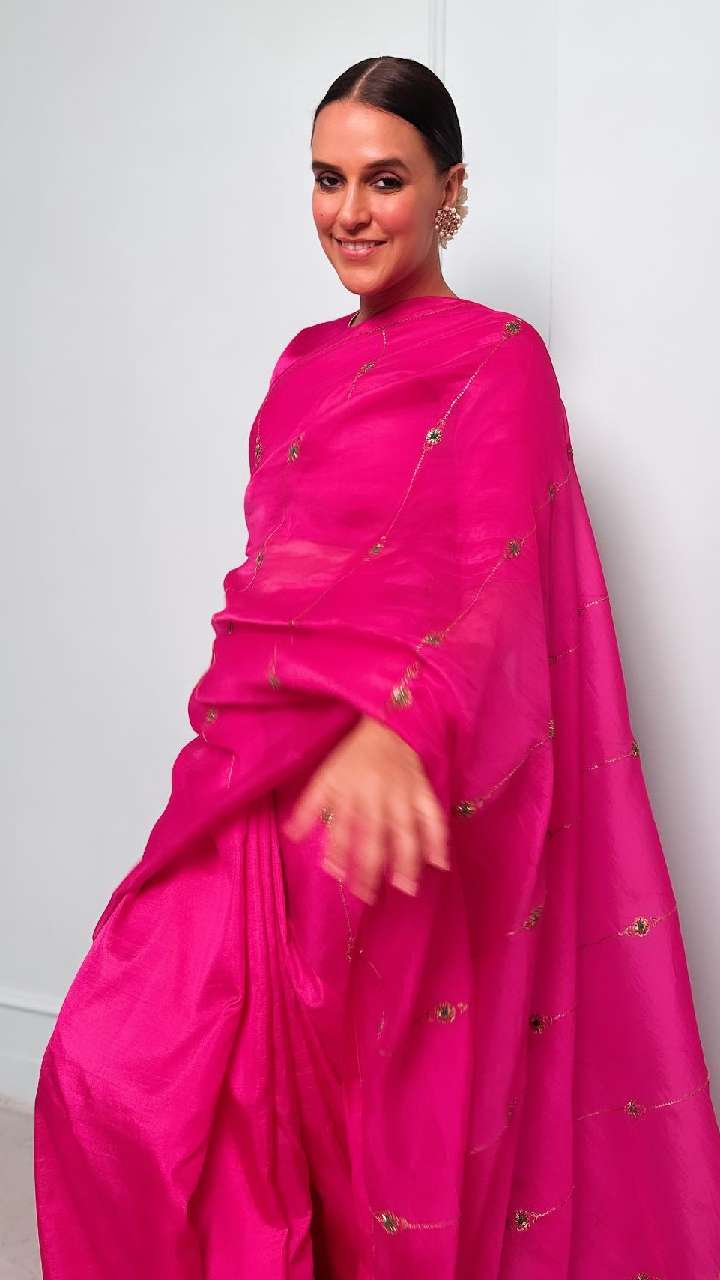 पिंक कलर की प्लेन साड़ी में नेहा धूपिया का लुक शानदार लग रहा है। आप भी इस तरह के प्लेन साड़ी लुक को कैरी कर सकती हैं।
