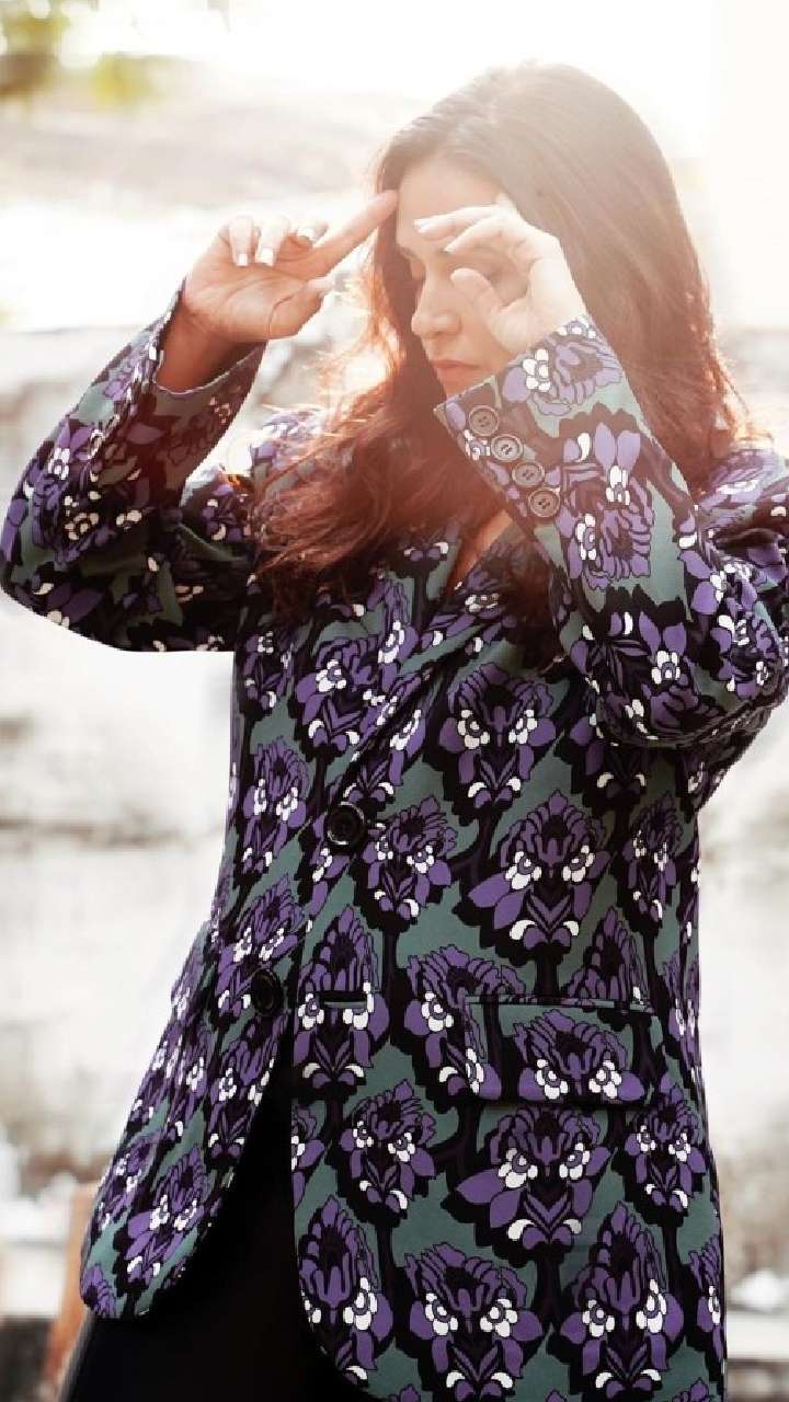 रोडीज होस्ट ने अपनी इन तस्वीरों में फ्लावर प्रिंटेड ब्लेजर, ब्लैक पैंट और ब्रालेट पहना हुआ हैं।