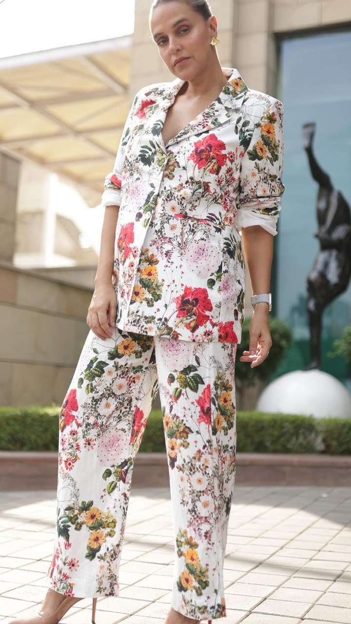 एक्ट्रेस का ये व्हाइट बेस फ्लोरल प्रिंट को ऑर्ड सेट लुक भी स्टाइलिश लुक दे रहा है।