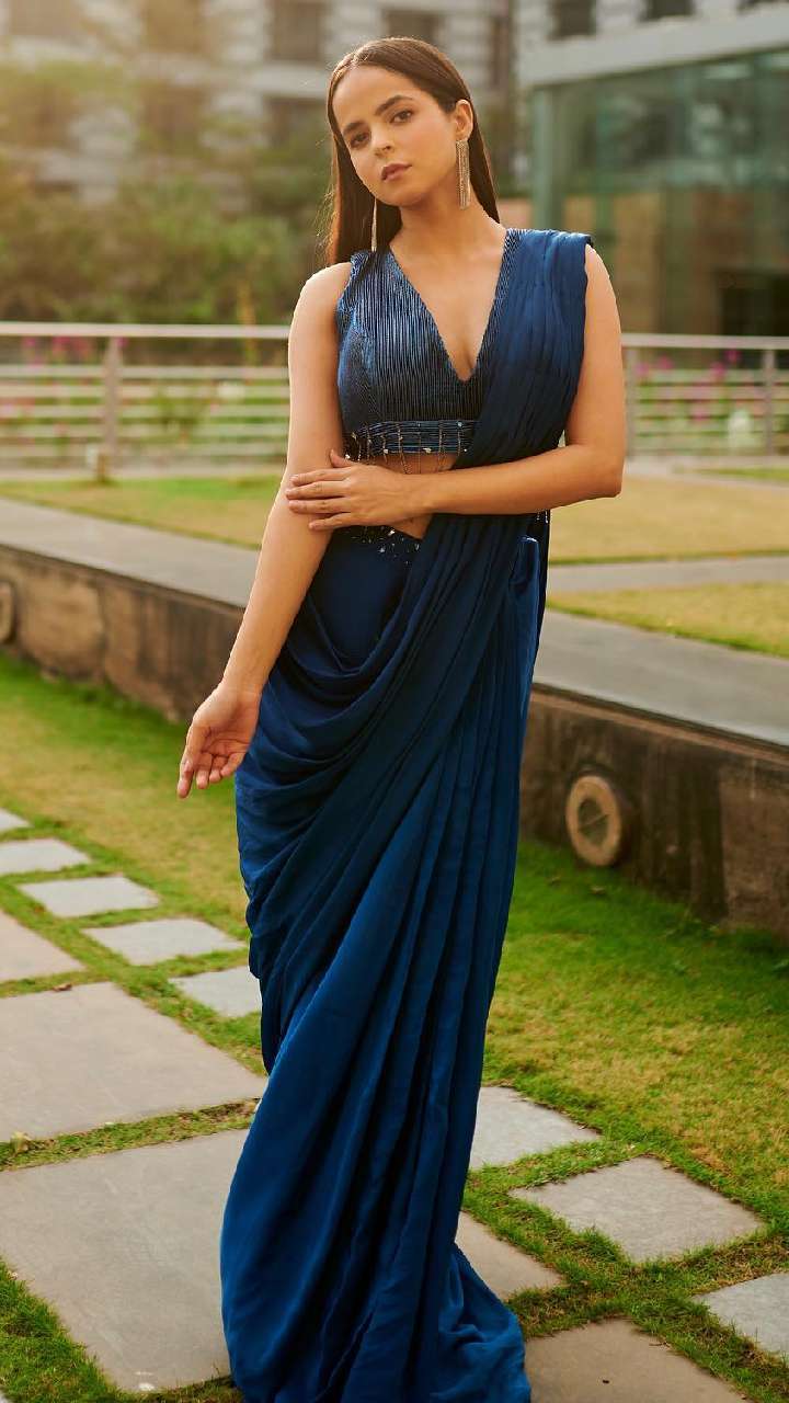 एक्ट्रेस ने प्लेन ब्लैक साड़ी के साथ कोर्सेट ब्लाउज पहना है, जिसमें वह काफी हॉट नजर आ रही हैं। आप भी पार्टी में इस तरह की साड़ी स्टाइल करके शानदार लग सकती हैं।