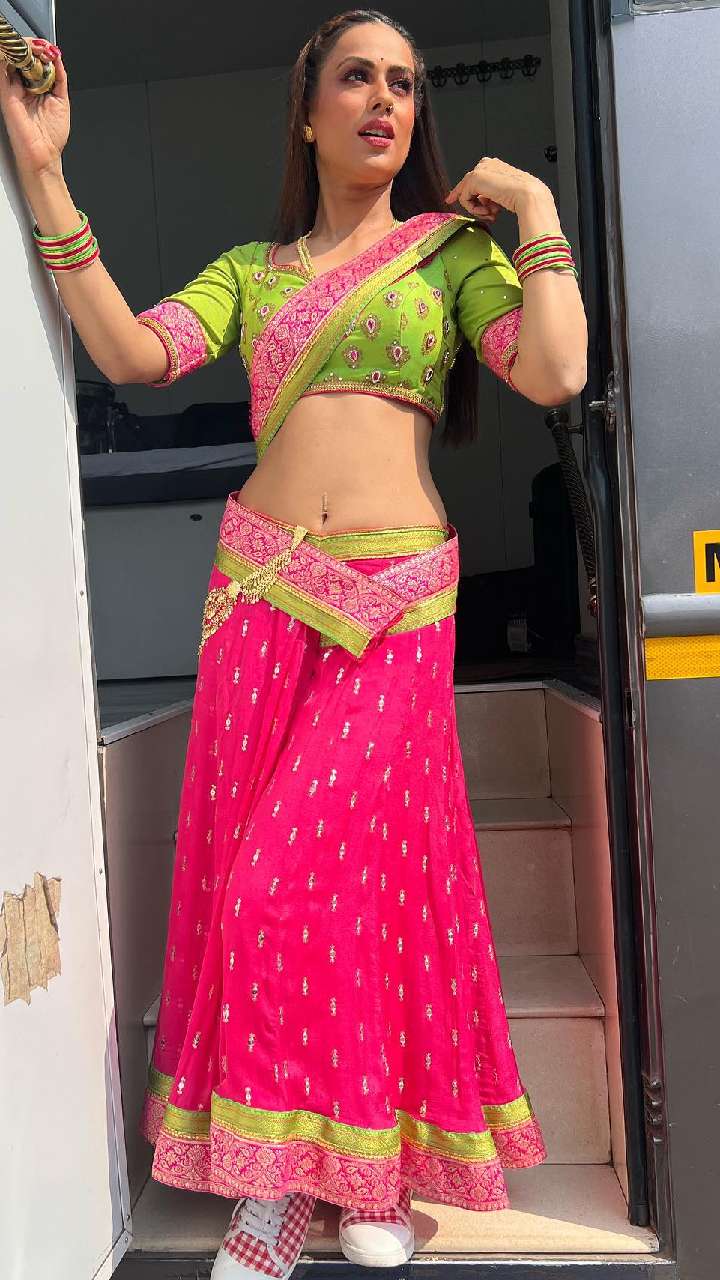 आप भी एक्ट्रेस की तरह पिंक कलर के मिरर वर्क जॉर्जेट लहंगे कंट्रास्ट ग्रीन चोली में खूबसूरत दिख सकती हैं। इसके साथ पिंक कलर का सिल्क दुपट्टा पहना गया है।