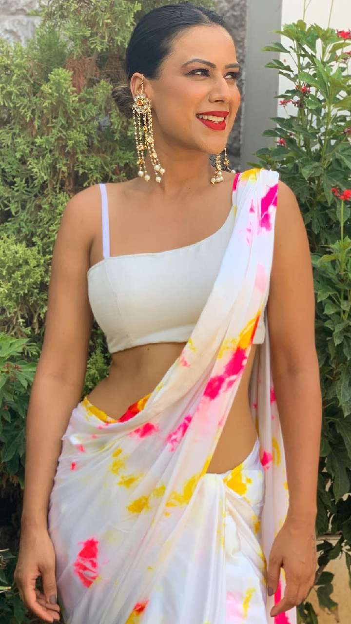 निया शर्मा का इस नूडल स्ट्रैप मल्टी फ्लोरल प्रिंट चोली में सेसी अंदाज देखा जा सकता है।