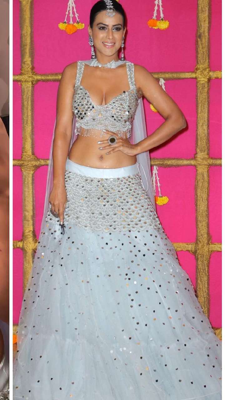 संगीत सेरेमनी के लिए आप निया के इस स्काई ब्लू हेवी वर्क लहंगे को ट्राई कर सकती हैं। हैवी लहंगे के साथ डीवा की ऑफ शोल्डर सेसी चोली बेहद लग रही है।