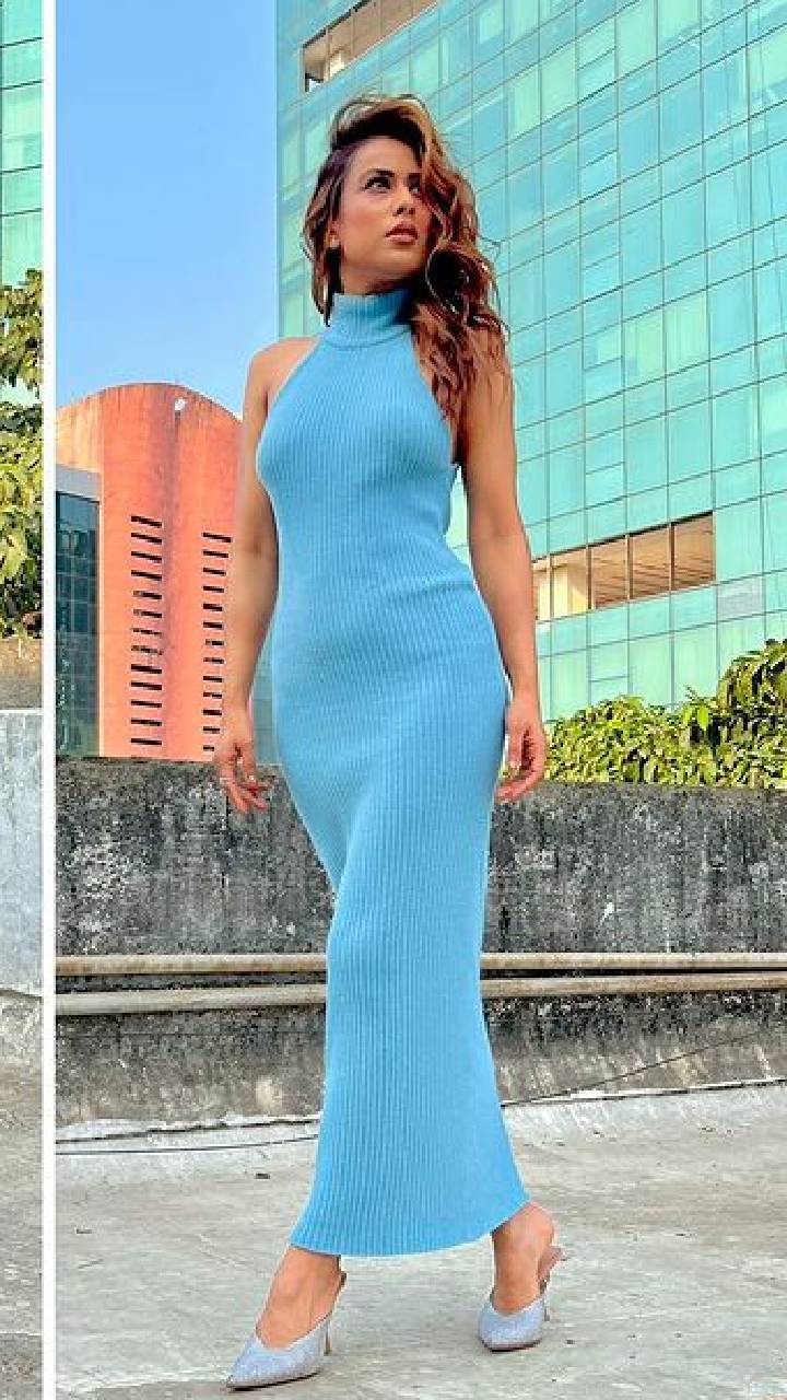 ब्लू कलर की इस बॉडीकॉन ड्रेस में एक्ट्रेस अपना परफेक्ट फिगर फ्लॉन्ट कर रही हैं।
