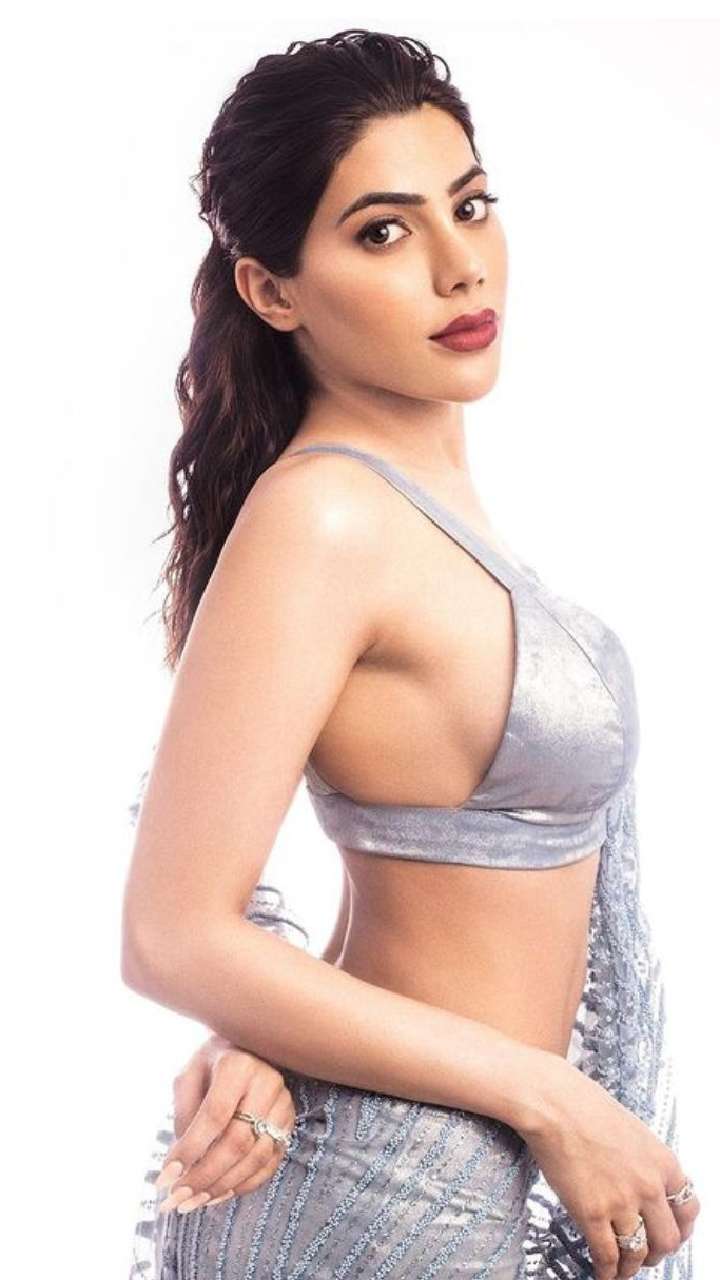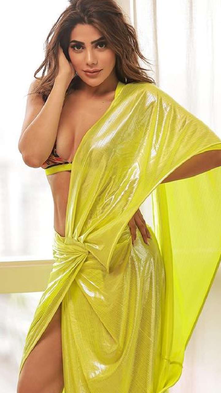 निक्की तंबोली हॉट साड़ी पहने चार्मिंग पोज देती हसीन लग रही हैं।