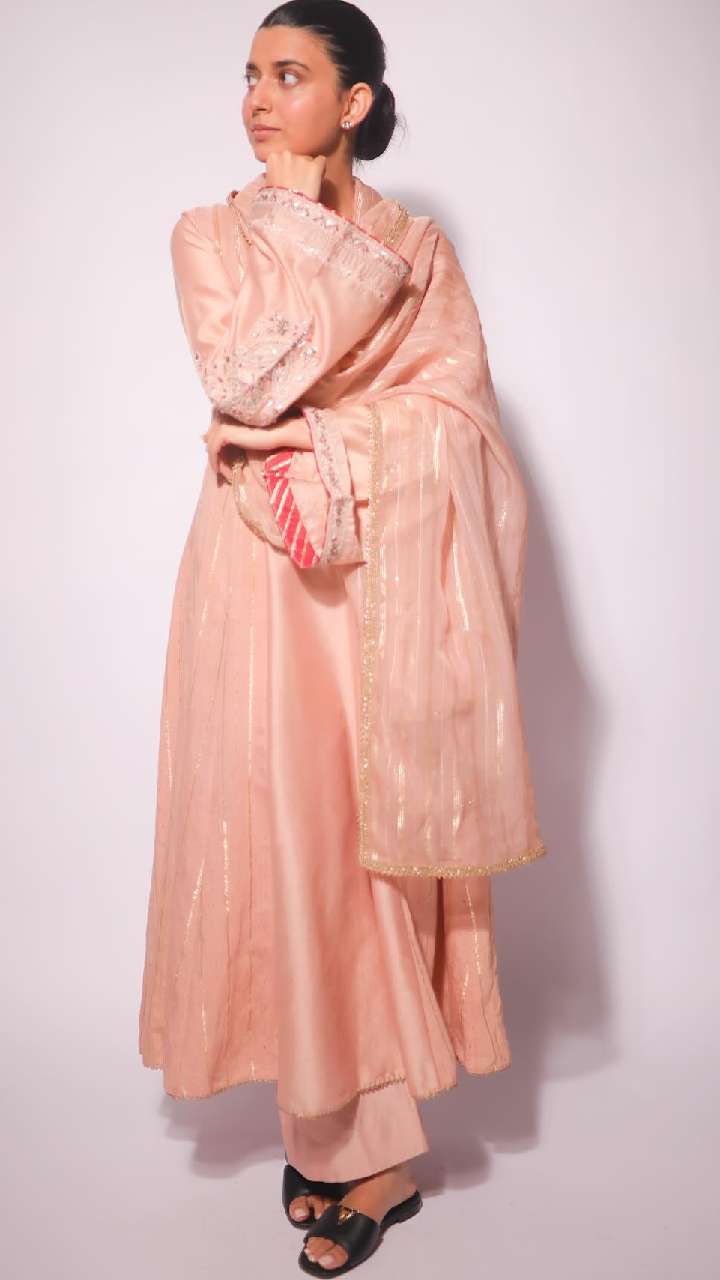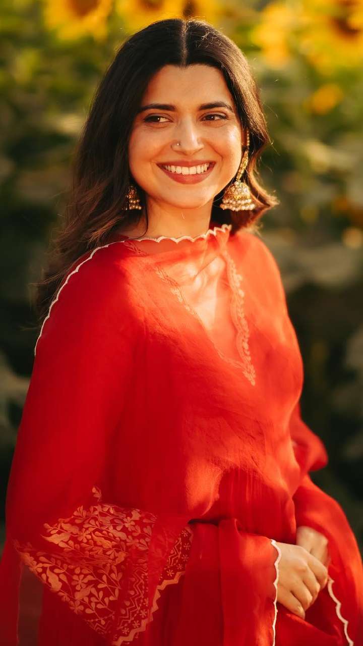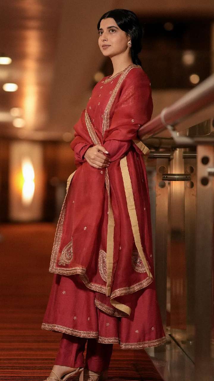 एक्ट्रेस का लॉन्ग रेड सूट देखने में बेहद एलिगेंट लुक दे रहा है। आप ऐसे सूट को ब्रेड हेयर स्टाइल के साथ भी कैरी कर सकती हैं।