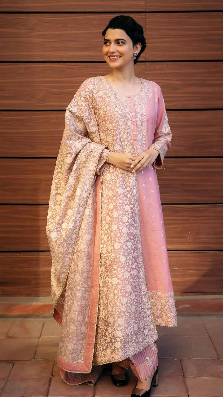 त्योहारों और फंक्शन में डिसेंट और ग्लैमरस लुक लेने के लिए एक्ट्रेस का यह लाइट एंब्रॉयडरी सूट आपके लिए बेस्ट ऑप्शन है। आप बोल्ड न्यूड मेकअप भी ट्राई करें।