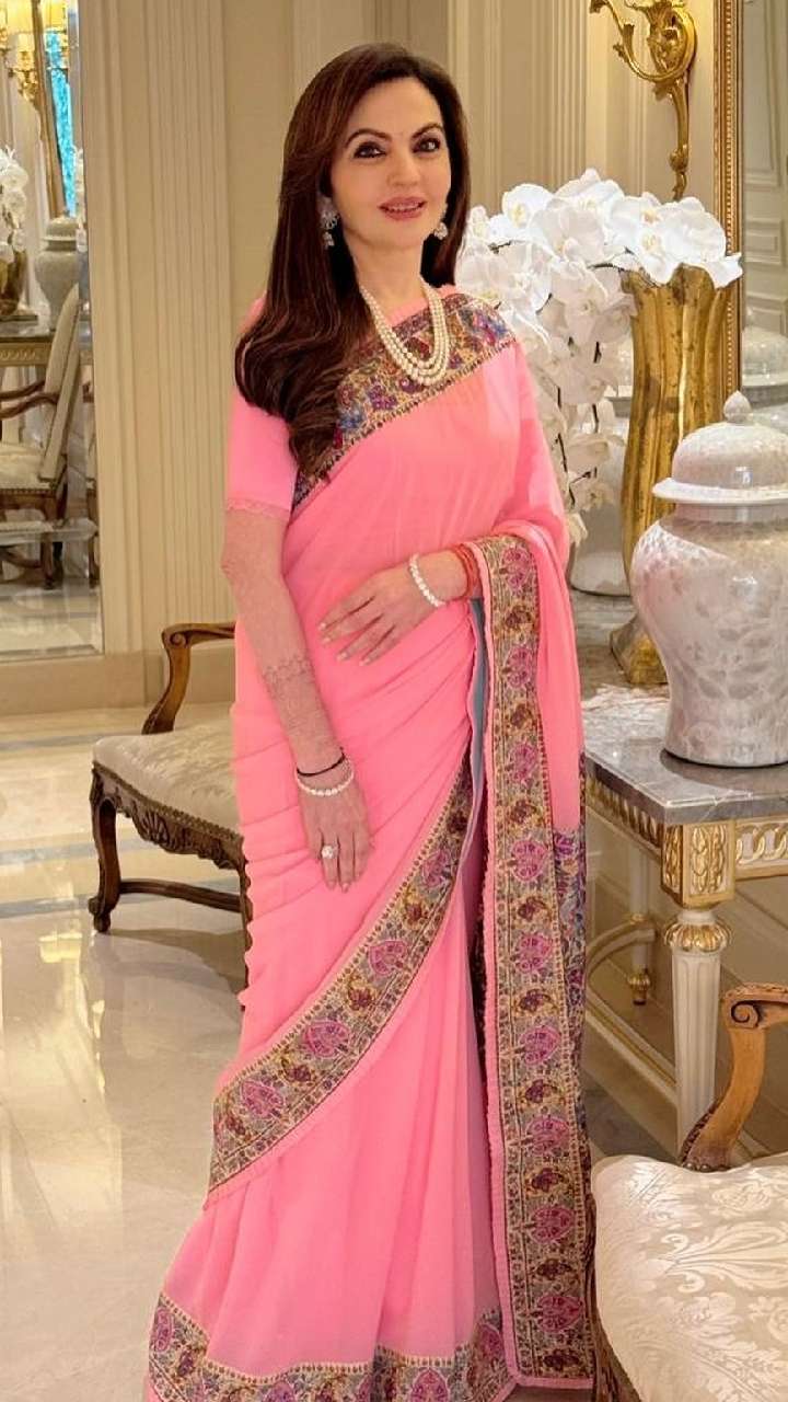 नीता जी की प्लेन पिंक एम्ब्रॉडयरी वाली साड़ी को भी मनीष मल्होत्रा ने डिजाइन किया है। इसके संग उन्होंने मोतियों का नेकपीस पहना हुआ है।
