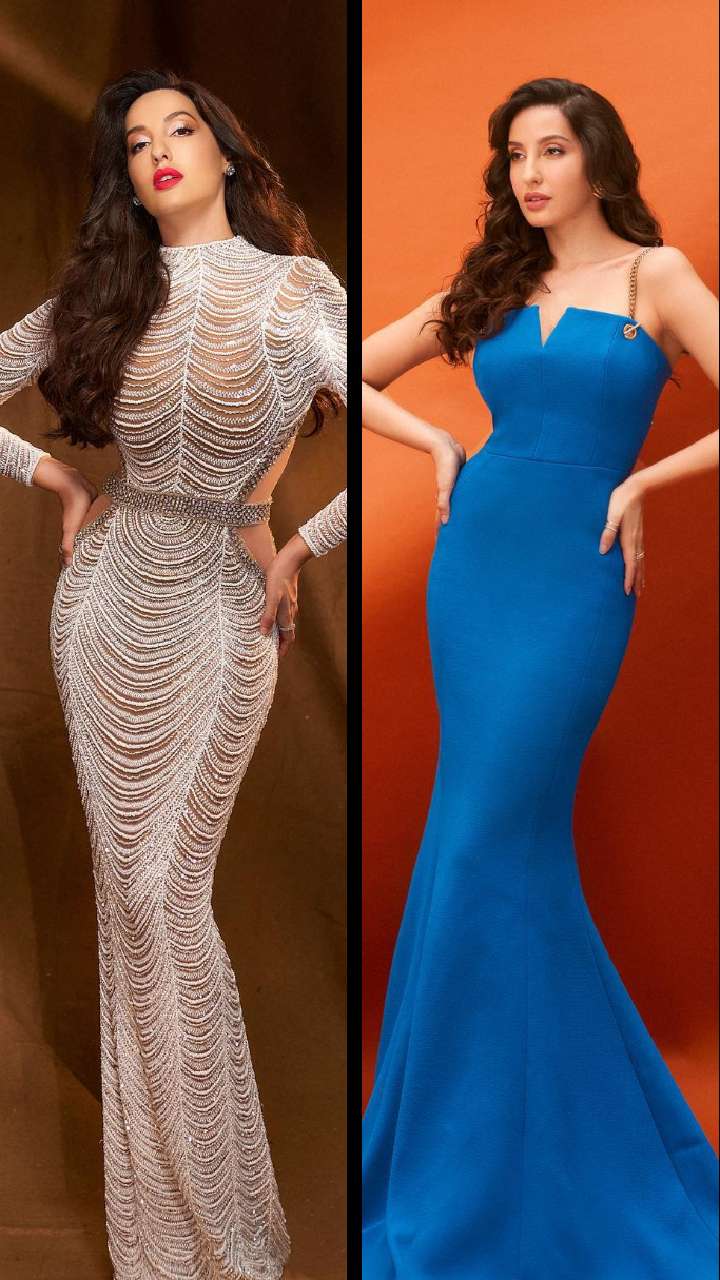 नोरा के इस सिल्वर कलर के बॉडी फिटिड गाउन को आप कॉकटेल पार्टी में पहनकर महफिल लूट सकती हैं।