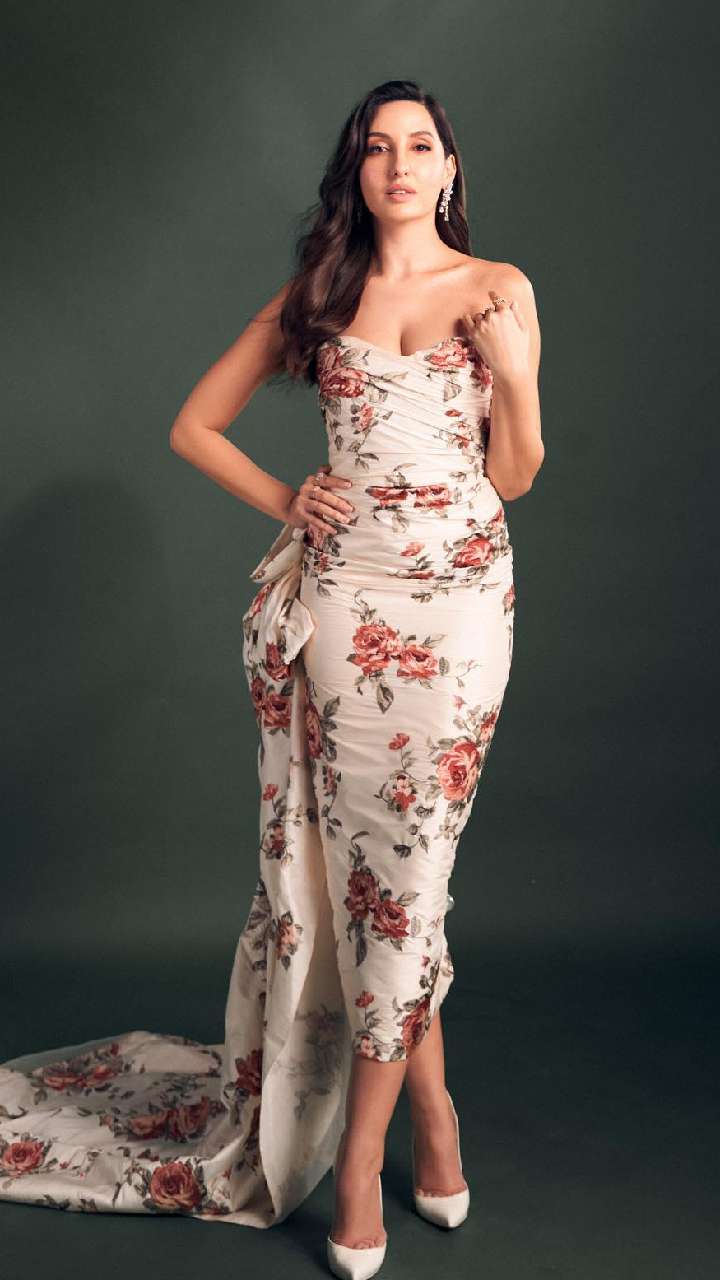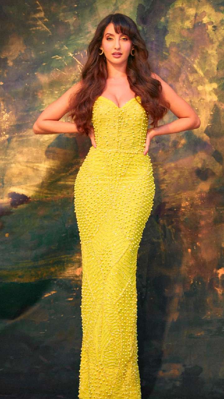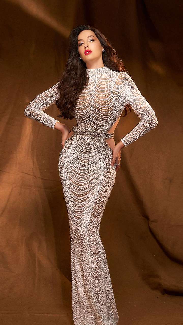 नोरा इस चमचमाते मिरर वर्क बॉडी हगिंग गाउन में कहर ढहा रही हैं। इसके साथ उन्होंने हाई मेसी बन हेयर स्टाइल और फ्रंट फ्लिक्स पेयर की है।