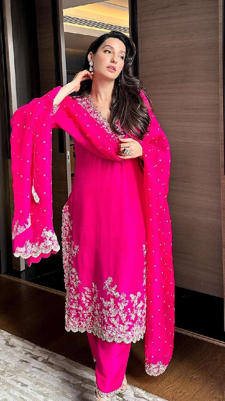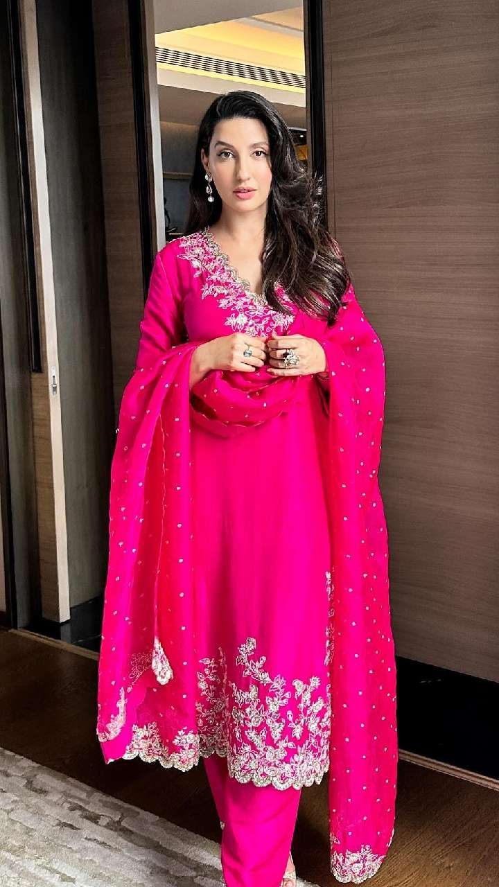 हाल में नोरा ने मेजेंटा पिंक कलर के हैंड वर्क प्लाजो सूट में अपना गॉर्जियस लुक शेयर किया है। जो कि इफ्तार पार्टी के लिए बेस्ट है।
