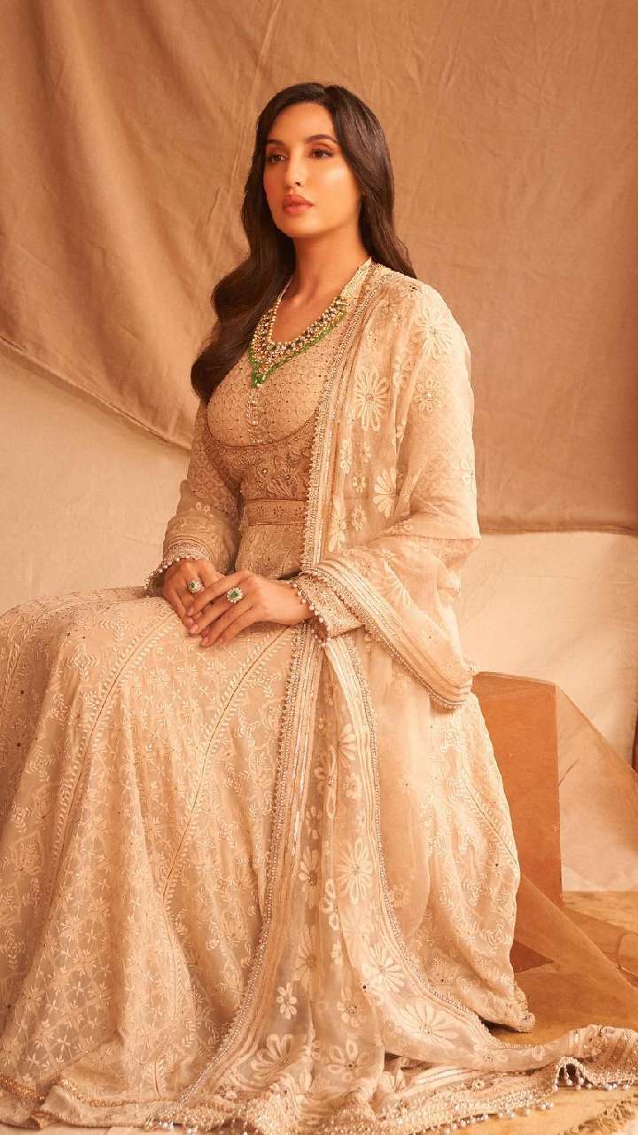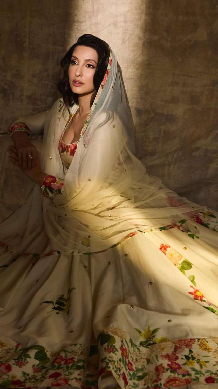 नोरा फतेही इस फ्लोरल प्रिंट हैवी घेर सूट में माशाल्लाह गजब की खूबसूरत लग रही हैं। इफ्तार पार्टी में आप इस लुक को जरूर कॉपी करें।