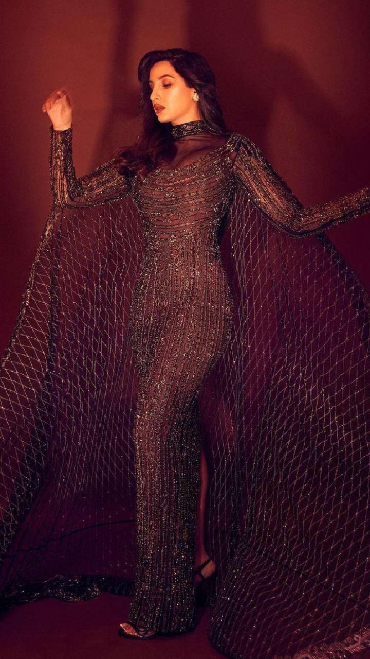 नोरा का ये शिमरी गाउन विद नेटिड श्रग लुक काफी ट्रेंडी है।