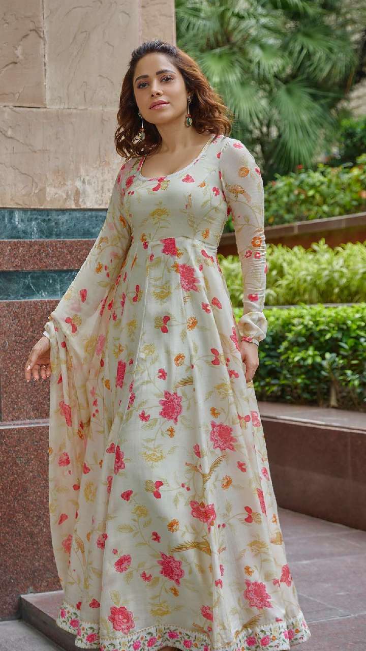 ऑफ व्हाइट कलर का ये अनारकली सूट बहुत सुंदर लग रहा है। आप दिवाली पर अनारकली सूट भी कैरी कर सकती हैं।