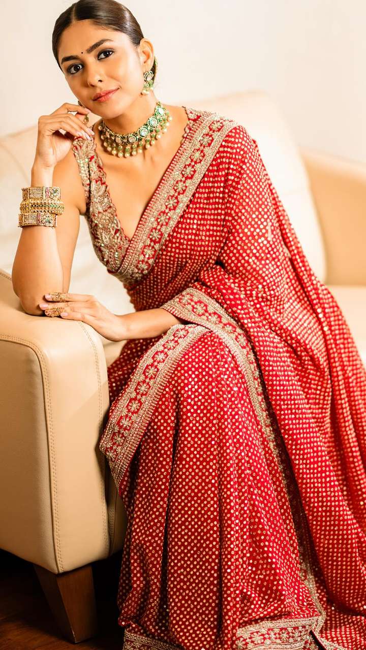 इस रेड कलर की प्रिंटेड नूडल स्ट्रैप चोली शरारा पर्ल नेकपीस शार्ट कर्ली हेयर में नुसरत कमाल की लग रही हैं।