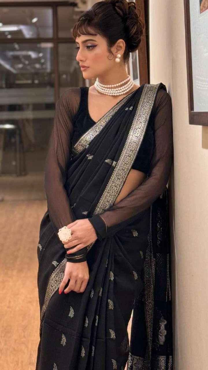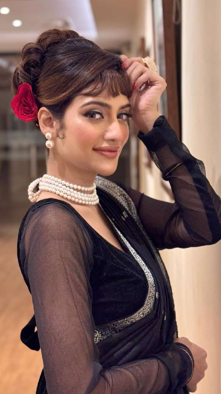 ब्लैक कलर की साड़ी में नुसरत काफी ज्यादा हॉट लग रहीं हैं। साथ ही आप एक्ट्रेस की तरह हेयरस्टाइल भी कर सकती हैं।