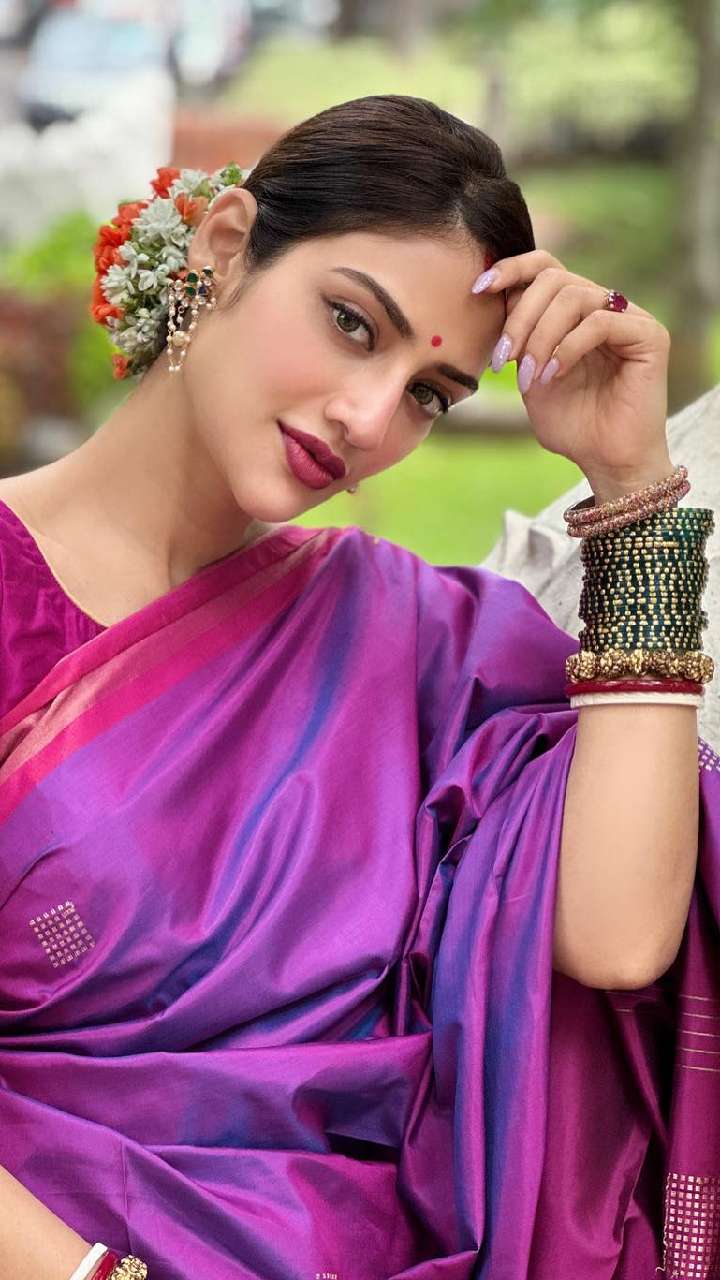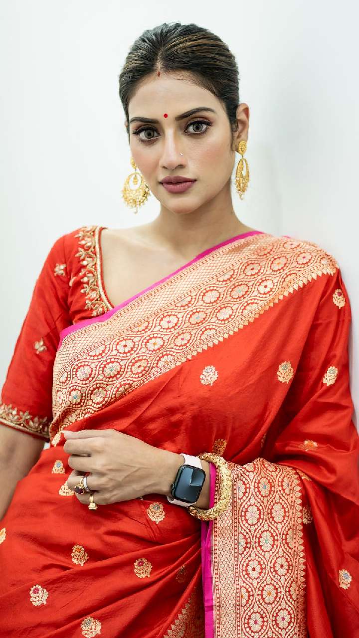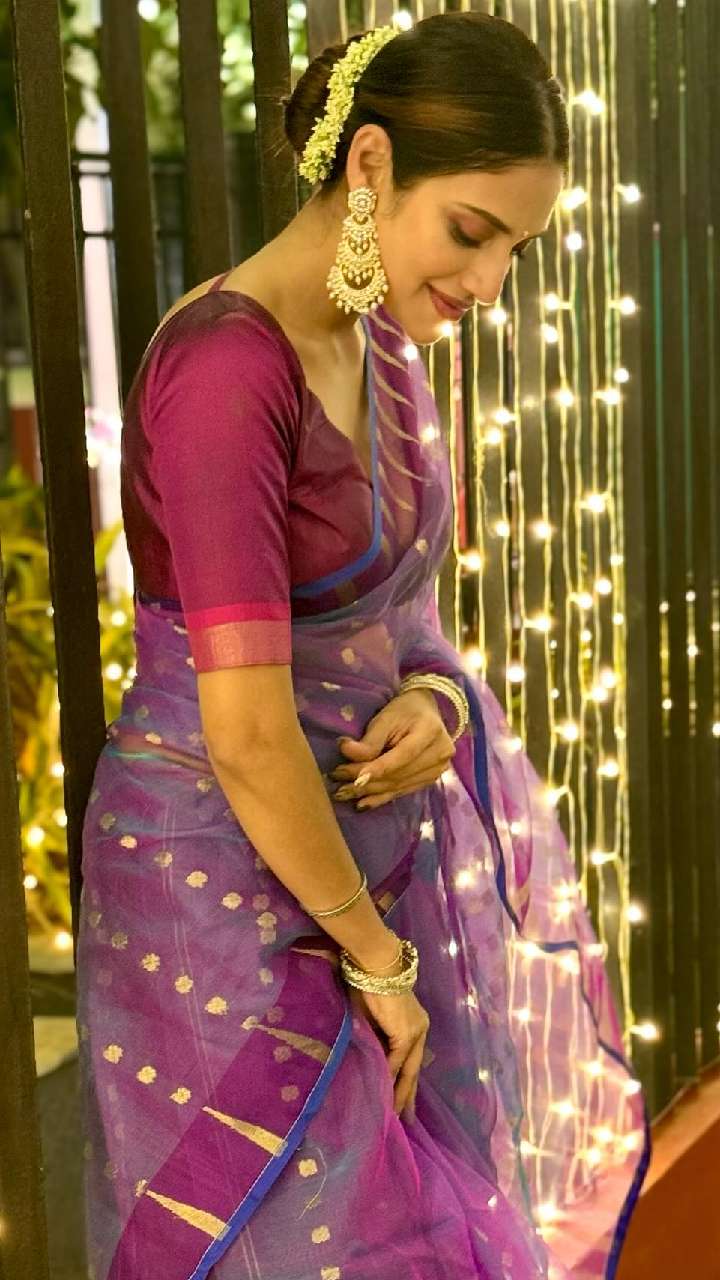 नुसरत जहां के पास हर तरह की साड़ी का शानदार कलेक्शन है। सिल्क साड़ी में भी एक्ट्रेस कमाल लग रहीं हैं।