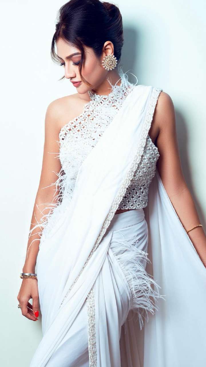 फेदर व्हाइट साड़ी में नुसरत का ये लुक काफी ज्यादा अट्रैक्टिव है। आप एक्ट्रेस के इस साड़ी लुक को हर मौके पर कैरी कर सकती हैं।