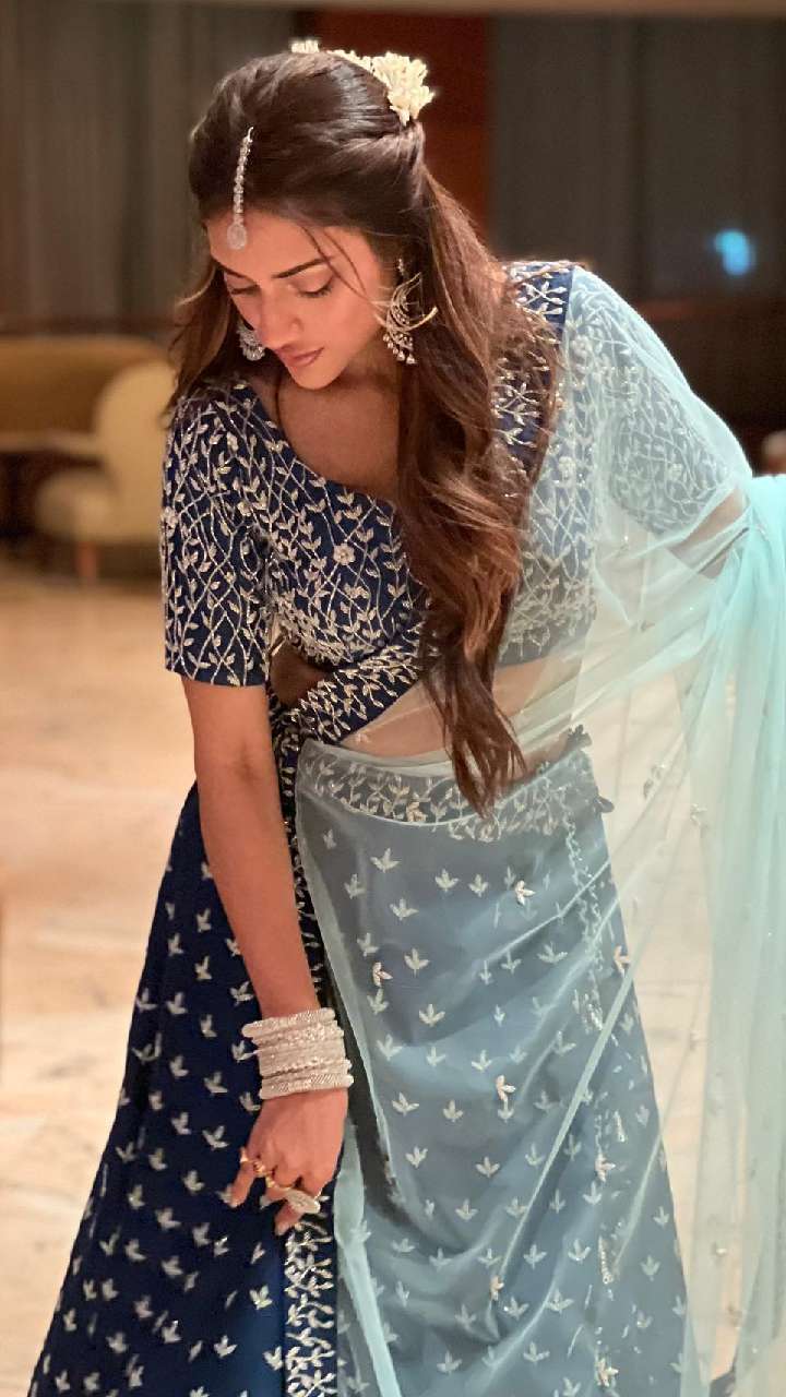 दिवाली या करवाचौथ के लिए नुसरत के जैसा हैवी वर्क डार्क ग्रीन लहंगा स्काई ब्लू दुप्पटा बेस्ट ऑप्शन है। जिसमें आप एकदम हुस्न परी नजर आएंगी।