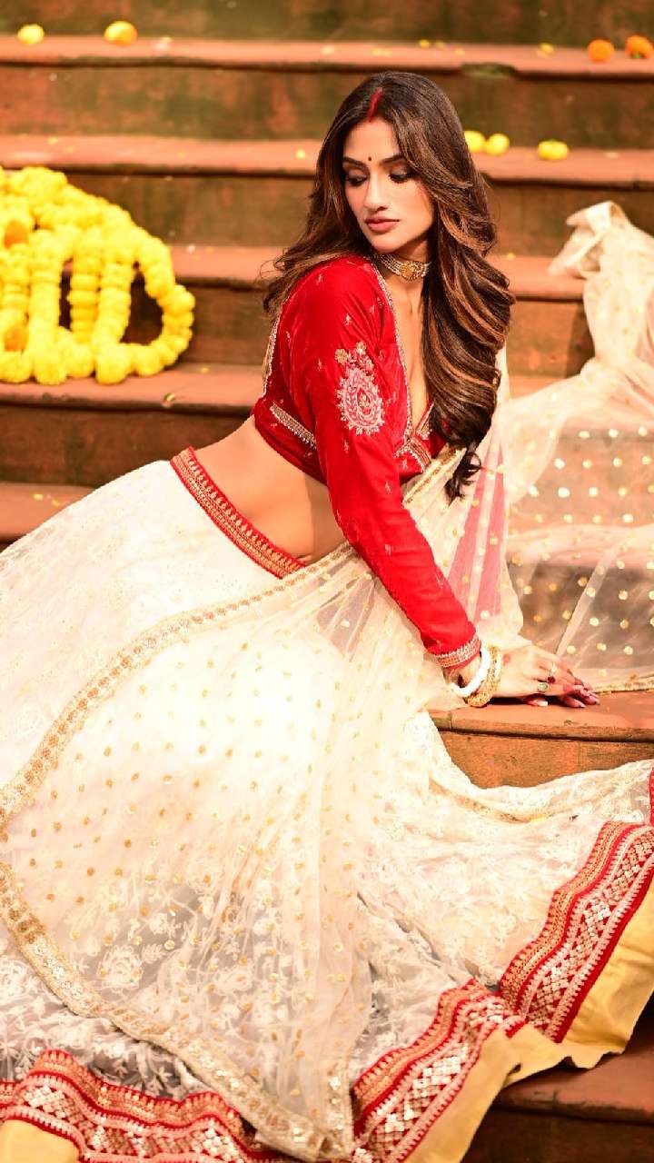 अभिनेत्री का व्हाइट लहंगा विद रेड फुल स्लीव्स चोली लुक एकदम ट्रेडिशनल लुक दे रहा है। ये आपके फेस्टिव लुक को एकदम खास बना देगा।