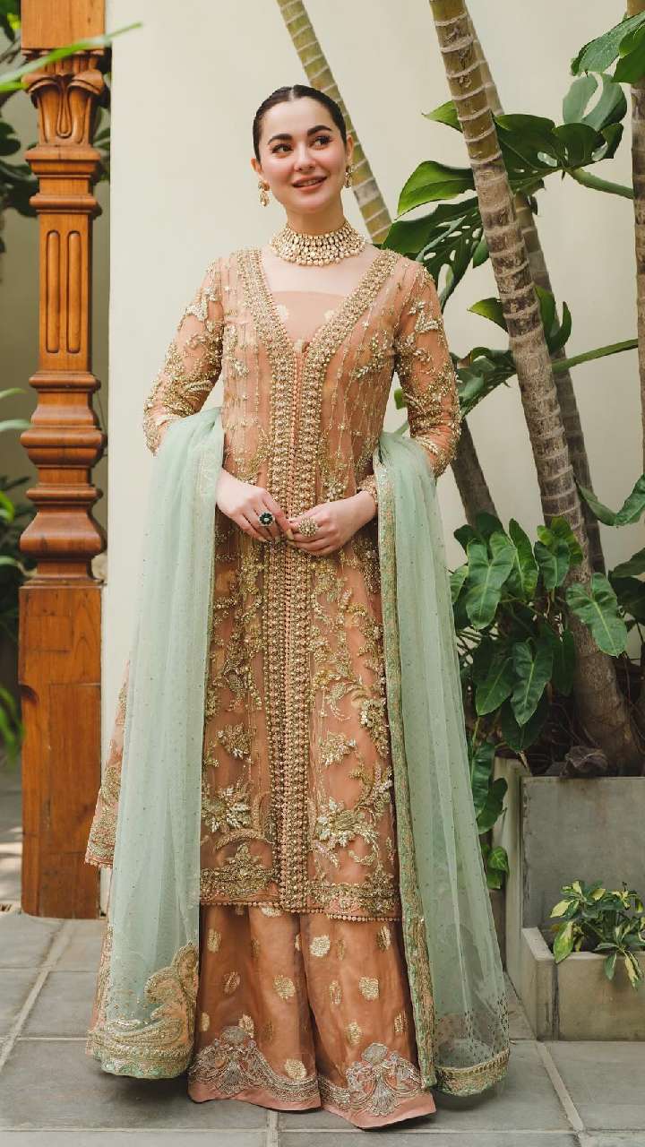 हानिया आमिर का ये व्ही नेक शरारा पैटर्न सूट भी काफी ज्यादा शानदार लग रहा है। यंग गर्ल्स पर इस तरह के सूट डिजाइन खूब जचेंगे।