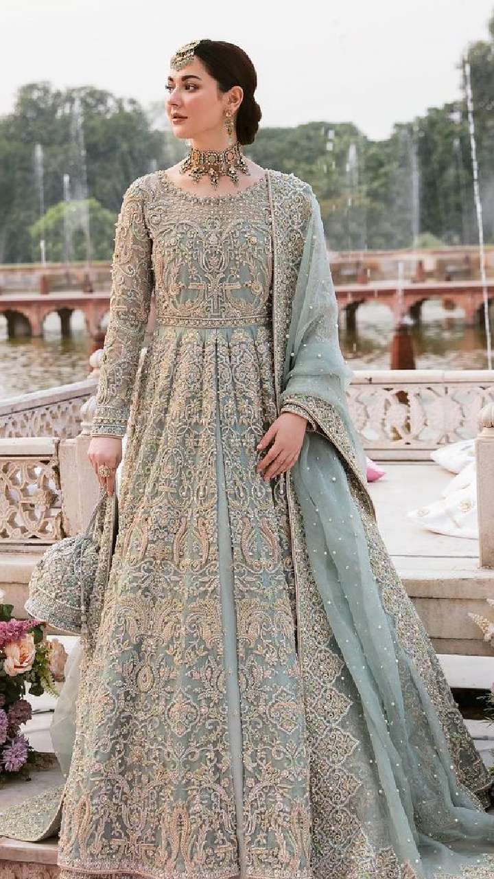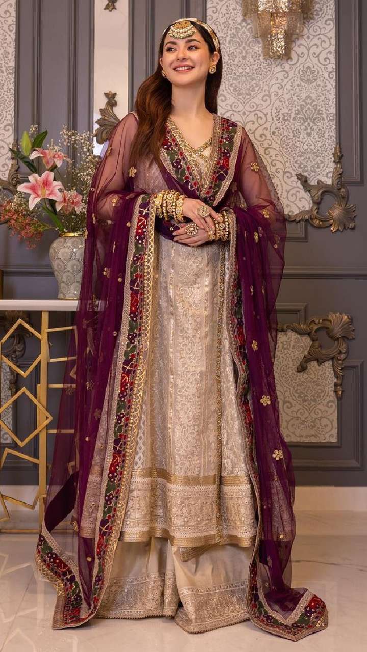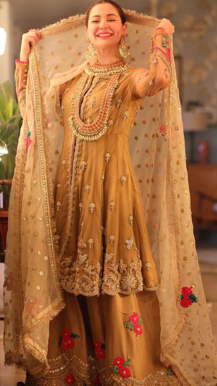 हानिया का ये पाकिस्तानी शरारा सूट लुक निकाह के लिए बेस्ट रहेगा।