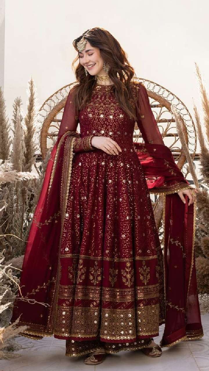 एक्ट्रेस का ये मरून कलर हेवी वर्क पाकिस्तानी सूट लुक बेहद खूबसूरत है। जिसे आप वेडिंग में पहन सकती हैं।