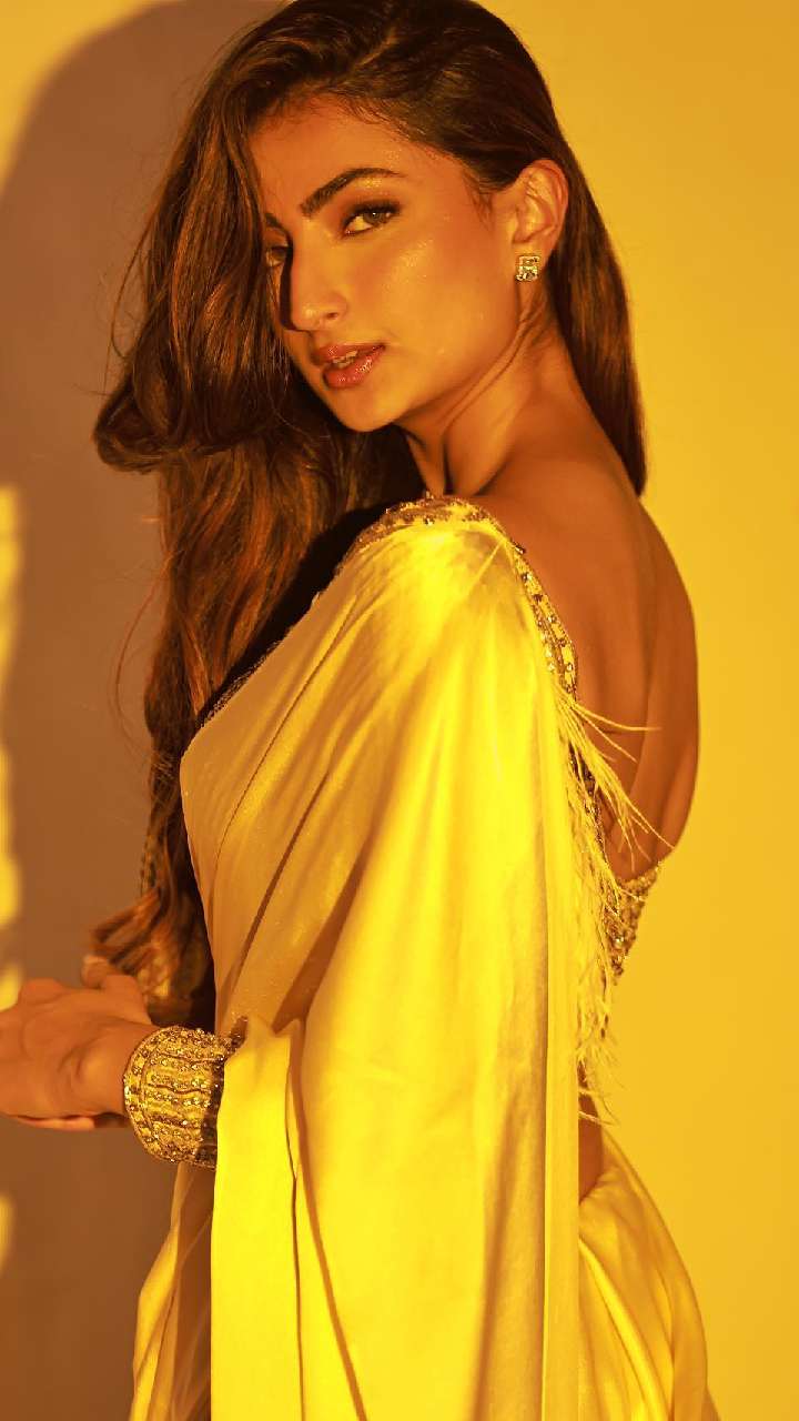 प्लेन ऑरेंज साड़ी में पलक तिवारी बहुत ज्यादा हॉट लग रहीं हैं। अगर आप सिंपल लुक कैरी करना पसंद करती हैं तो ये साड़ी लुक कैरी करें।
