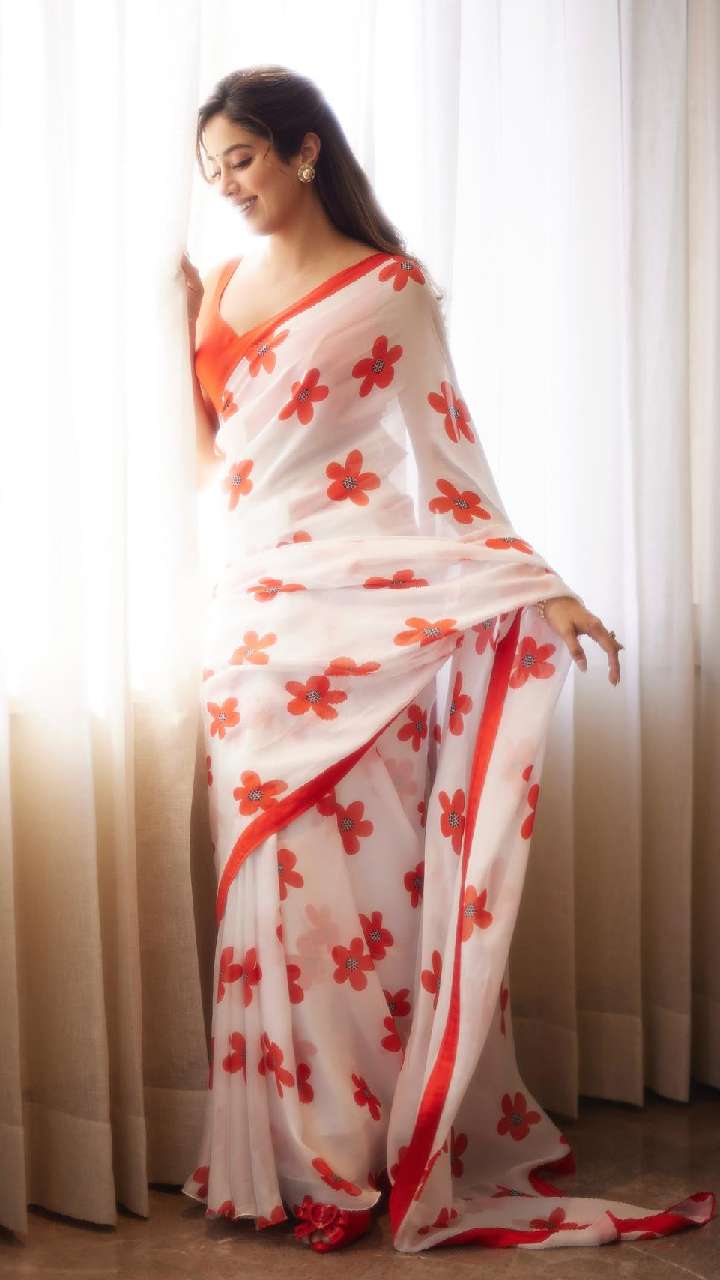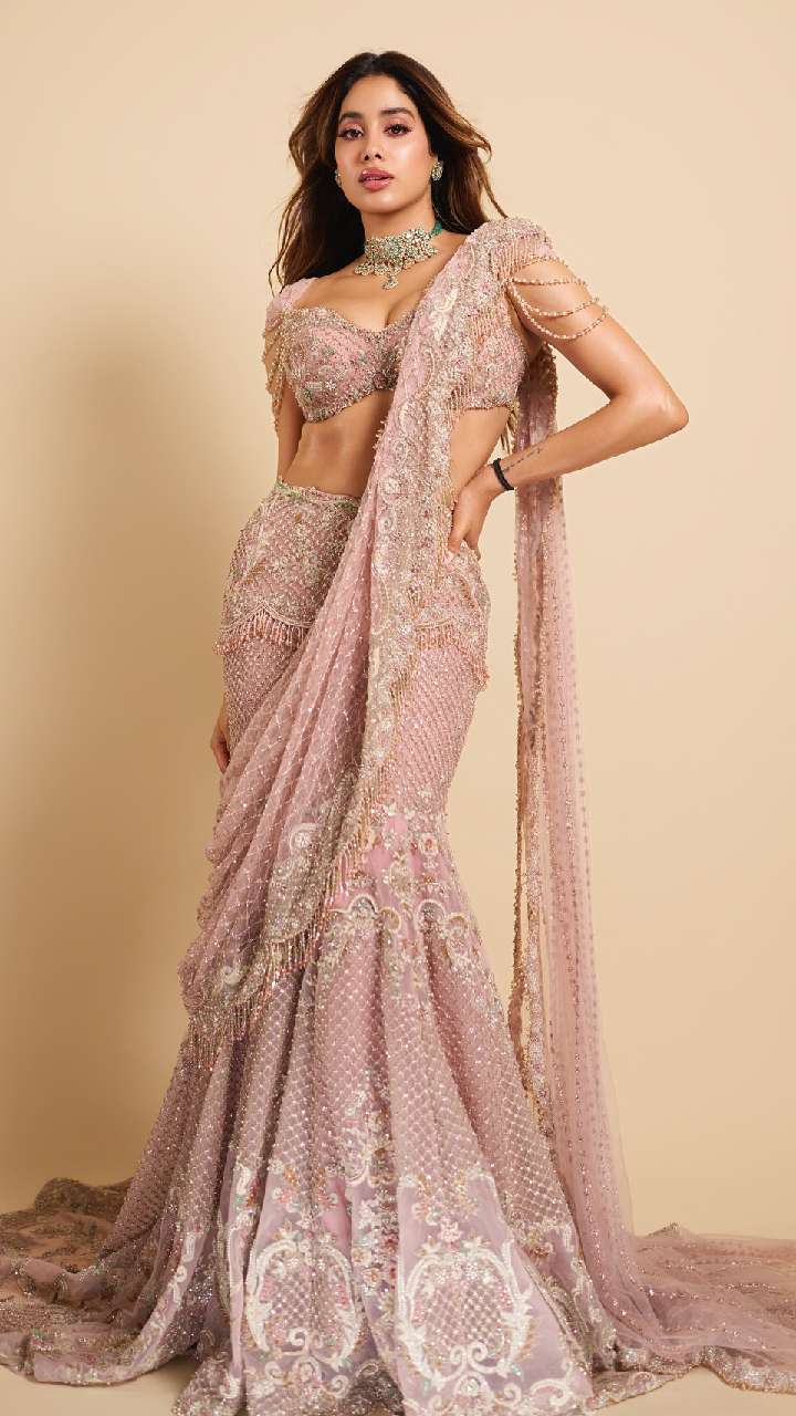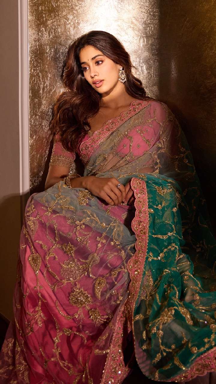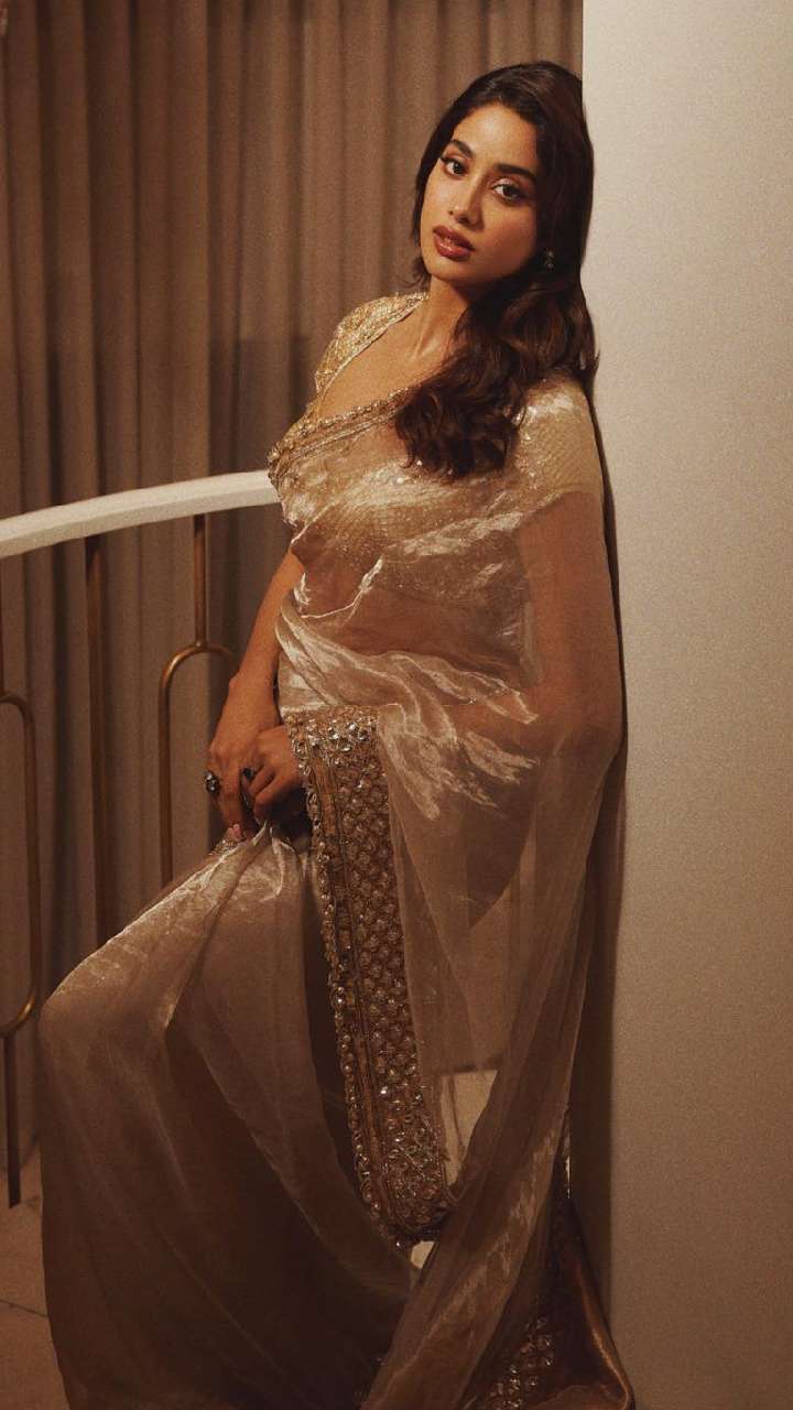 जाह्नवी के पास साड़ियों का ब्यूटीफुल कलेक्शन है। ऐसे में एक्ट्रेस की तरह हॉट दिखने के लिए शिमर साड़ी लुक को रीक्रिएट करें।