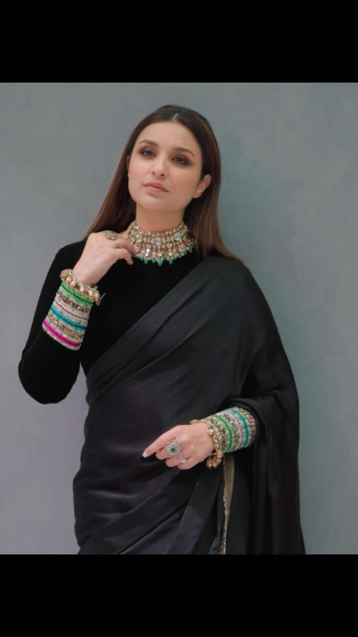 डीप नेक चोली के साथ परिणीति चोपड़ा ने ब्लैक कलर का शानदार लहंगा कैरी किया है। आप एक्ट्रेस के पूरे लुक को कॉपी कर सकती हैं।