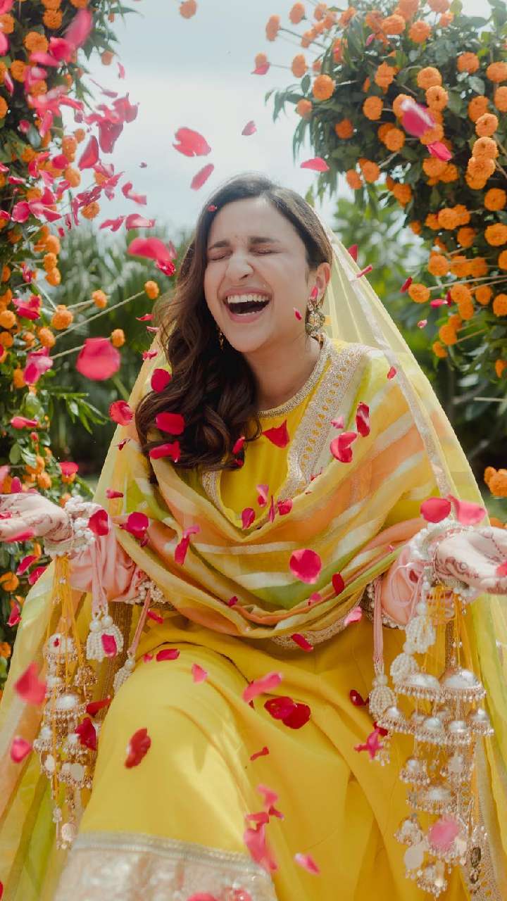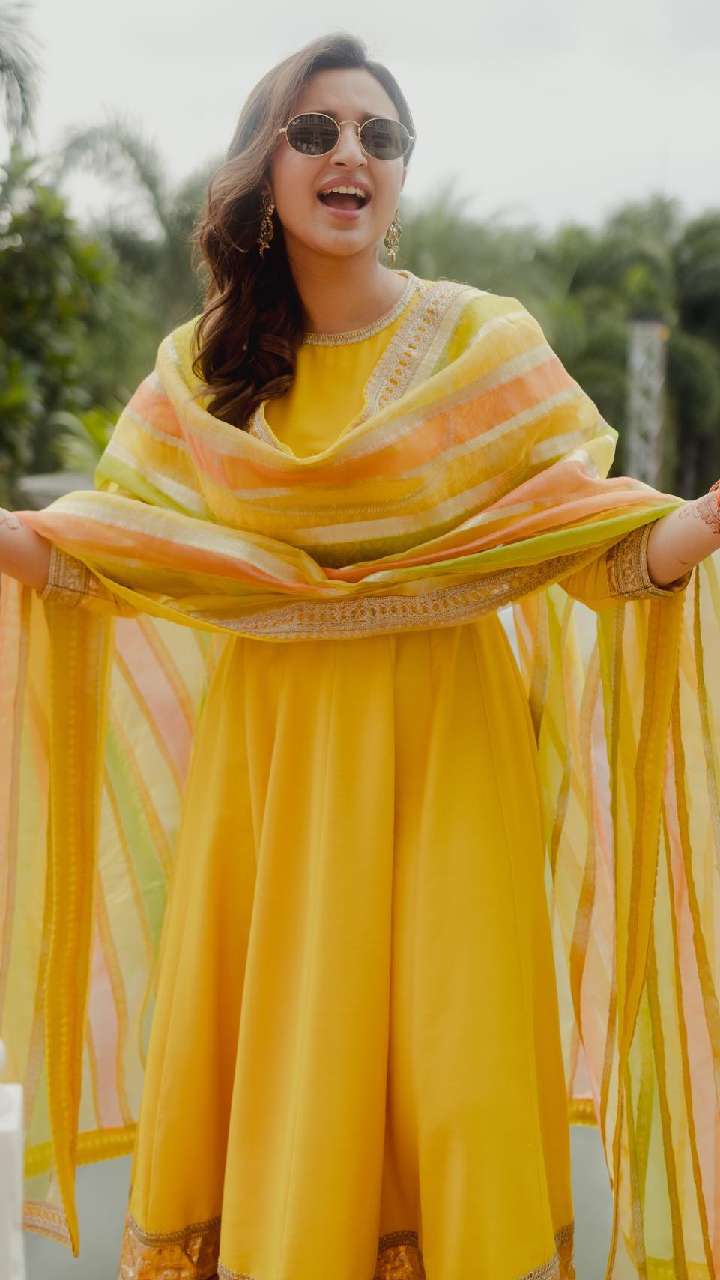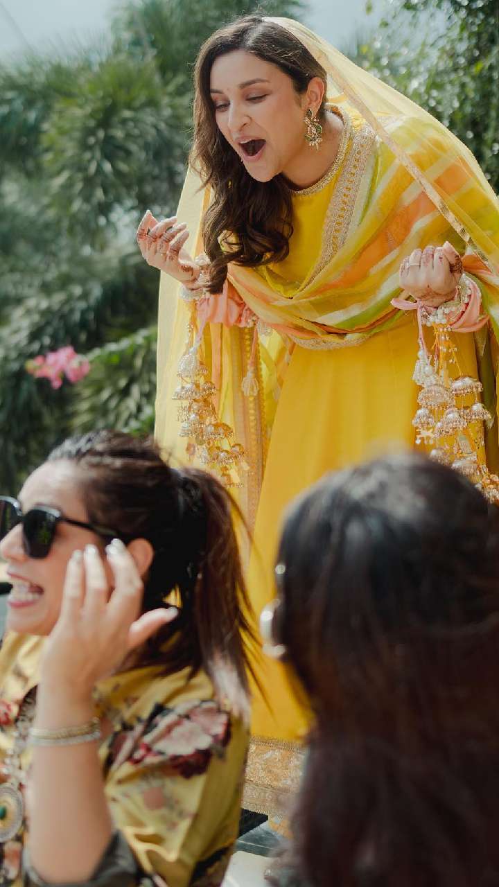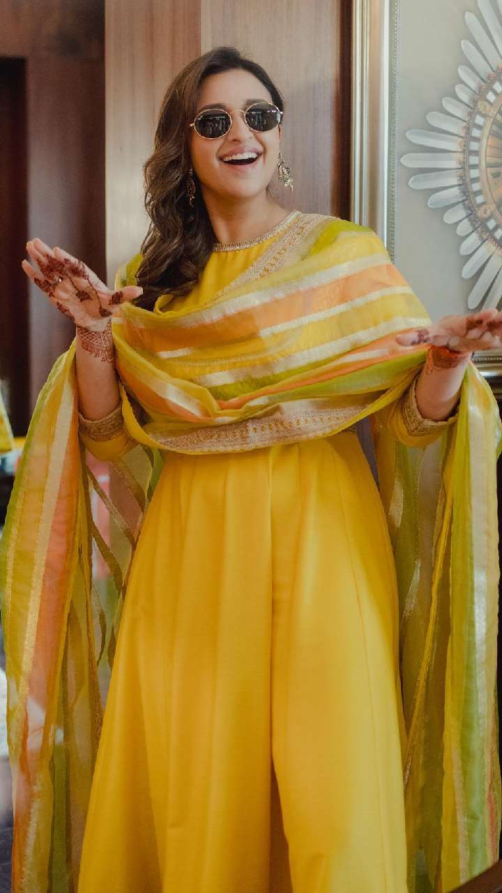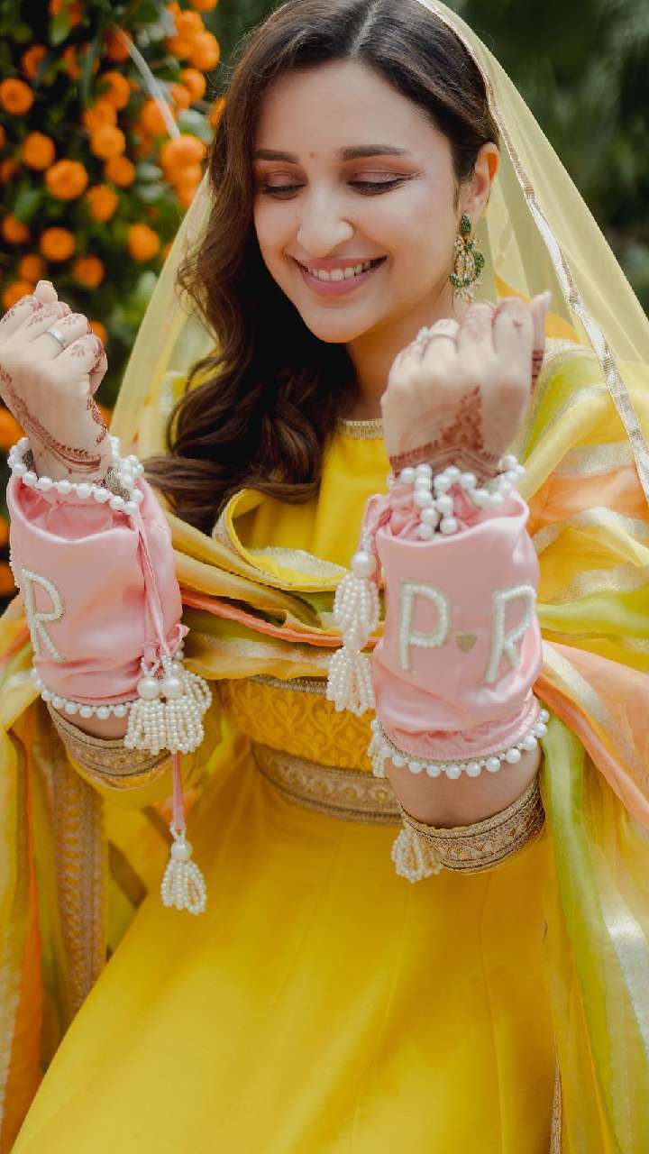 येलो कलर के सूट में परिणीति चोपड़ा काफी ज्यादा खूबसूरत लग रहीं हैं। साथ ही एक्ट्रेस के हाथ में राघव का नाम भी लिखा है।
