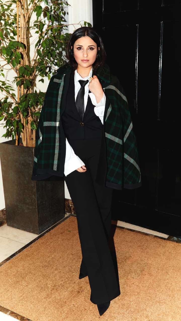 एक्ट्रेस ने व्हाइट शर्ट, ब्लैक कोट और पेंट के साथ ब्लैक टाई भी कैरी की है। परिणीति का यह लुक बेहद क्लासी है।