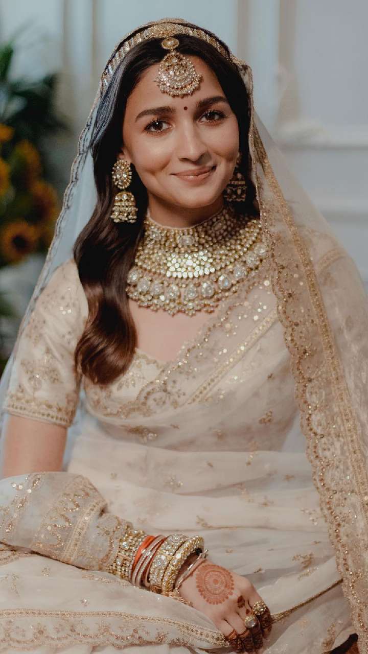 आलिया ने अपनी शादी वाले दिन लाइट क्रीम कलर की साड़ी पहनी थी। इसके साथ एक्ट्रेस ने कुंदन नेकपीस, झुमके पर माथा पट्टी से खुद को खूबसूरत बनाया हुआ था।