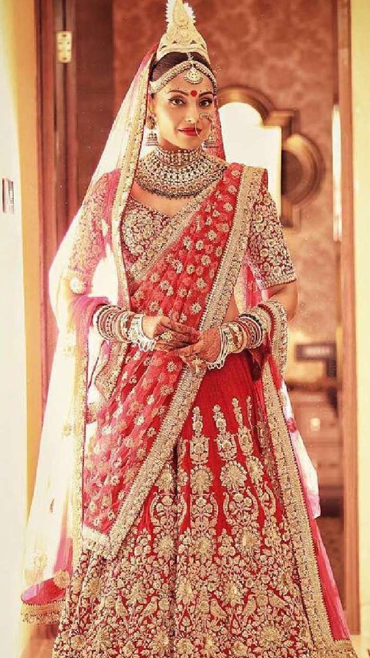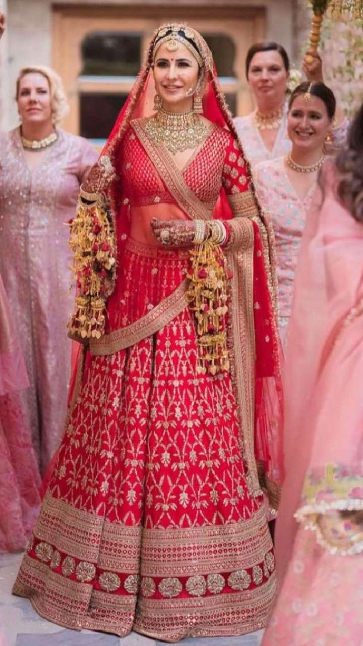 कटरीना कैफ ने शादी में लाल रंग का शादी का जोड़ा पहना था। जिसमें डीवा एकदम शाही लुक दे रही थीं।