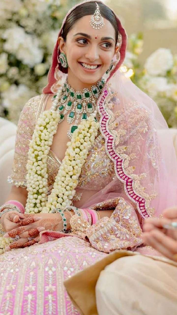 कियारा आडवाणी लाइट और डार्क पिंक शेड वाले शादी के जोड़े ग्रीन स्टोन ज्वैलरी में अप्सरा लग रही थीं।